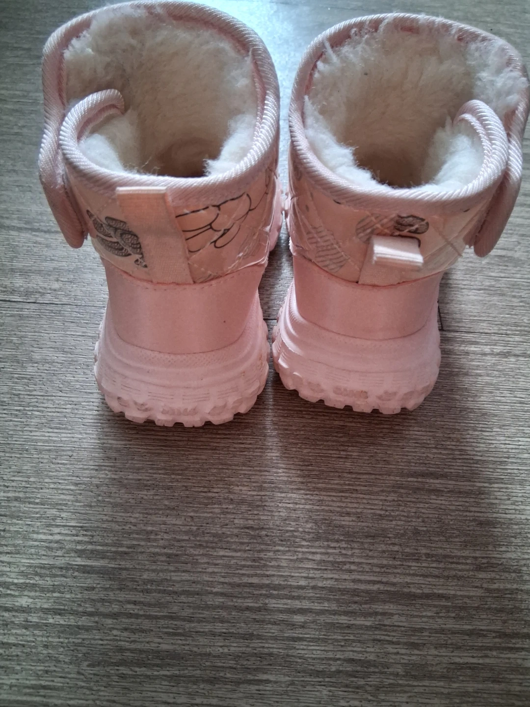 Cozy pink winter boots for little ones. They're insulated with faux fur lining to keep toes warm. The durable rubber sole offers good traction. These boots feature a sweet bunny and cloud pattern, perfect for keeping your little one's feet toasty during colder months! Size 6 for baby and toddler. Lightly used.