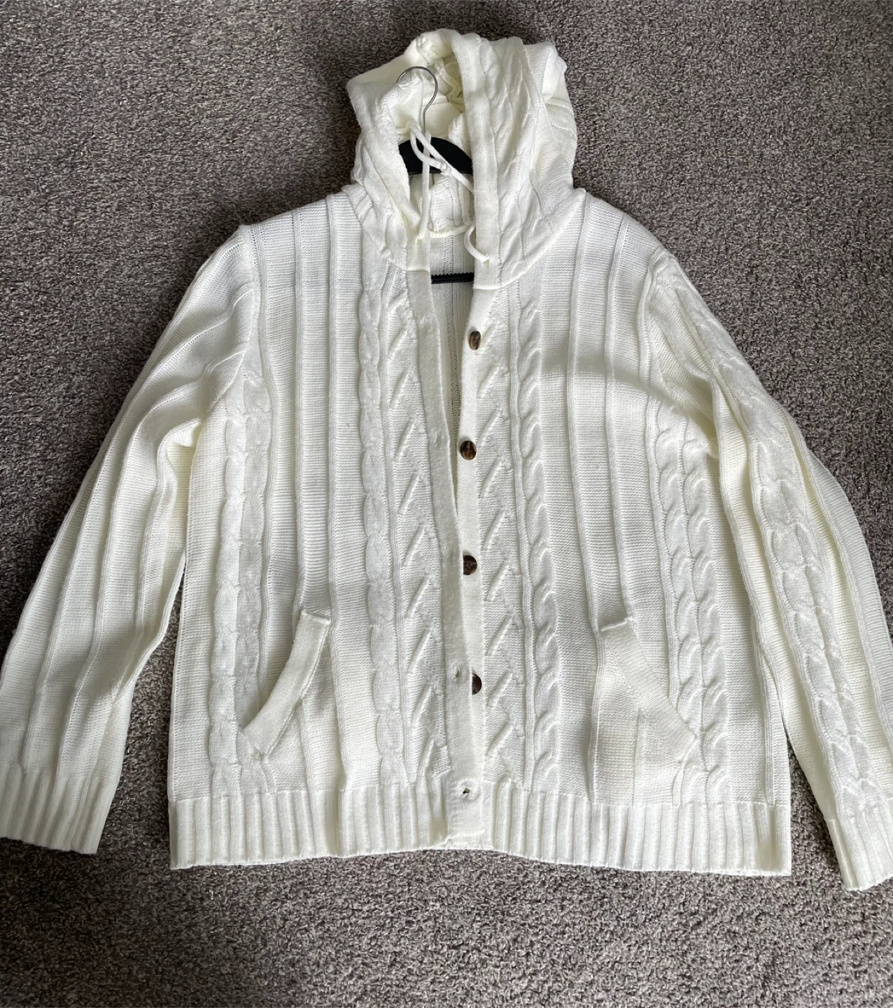 Cozy vintage white cable knit hooded cardigan with brown button front and pockets. The knit is soft and comfortable. Xxl but fits more like a large.