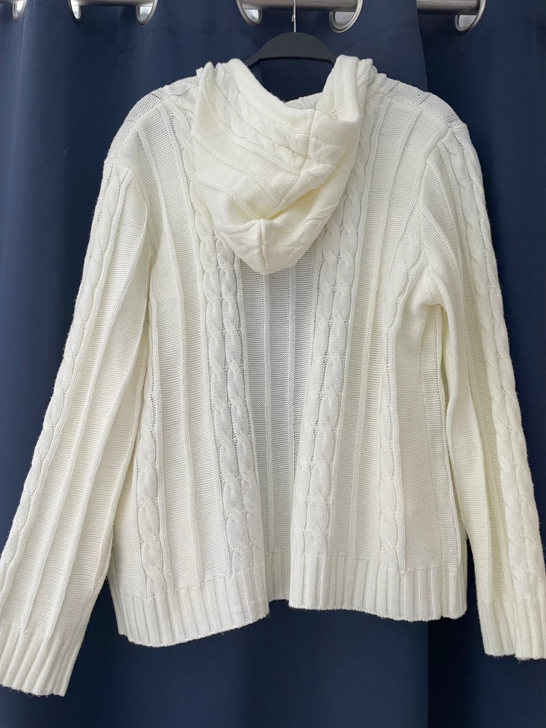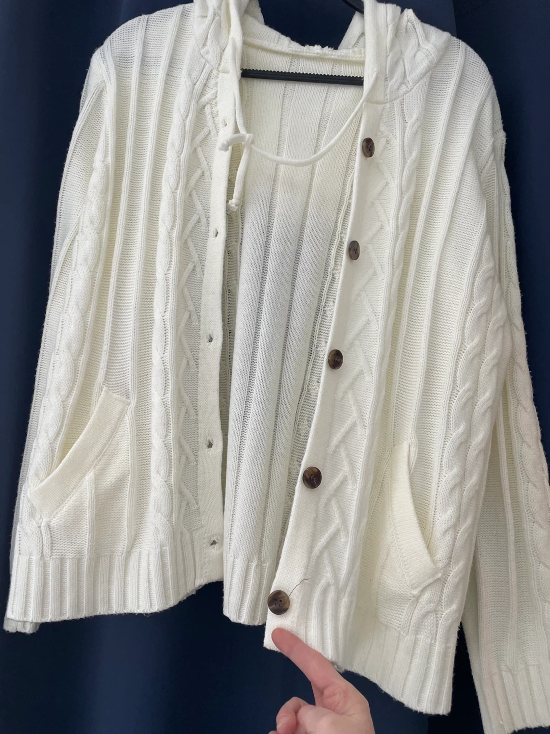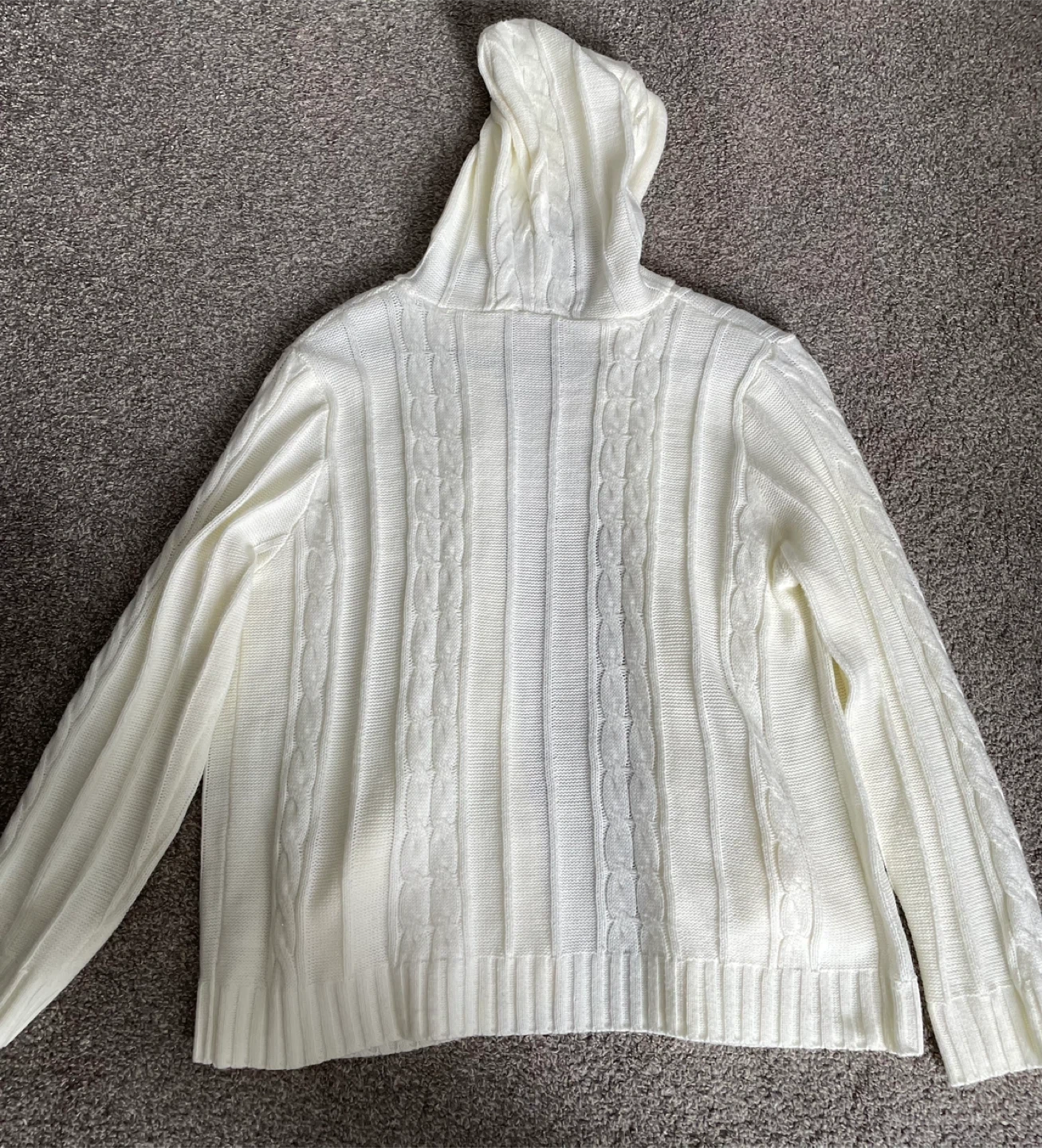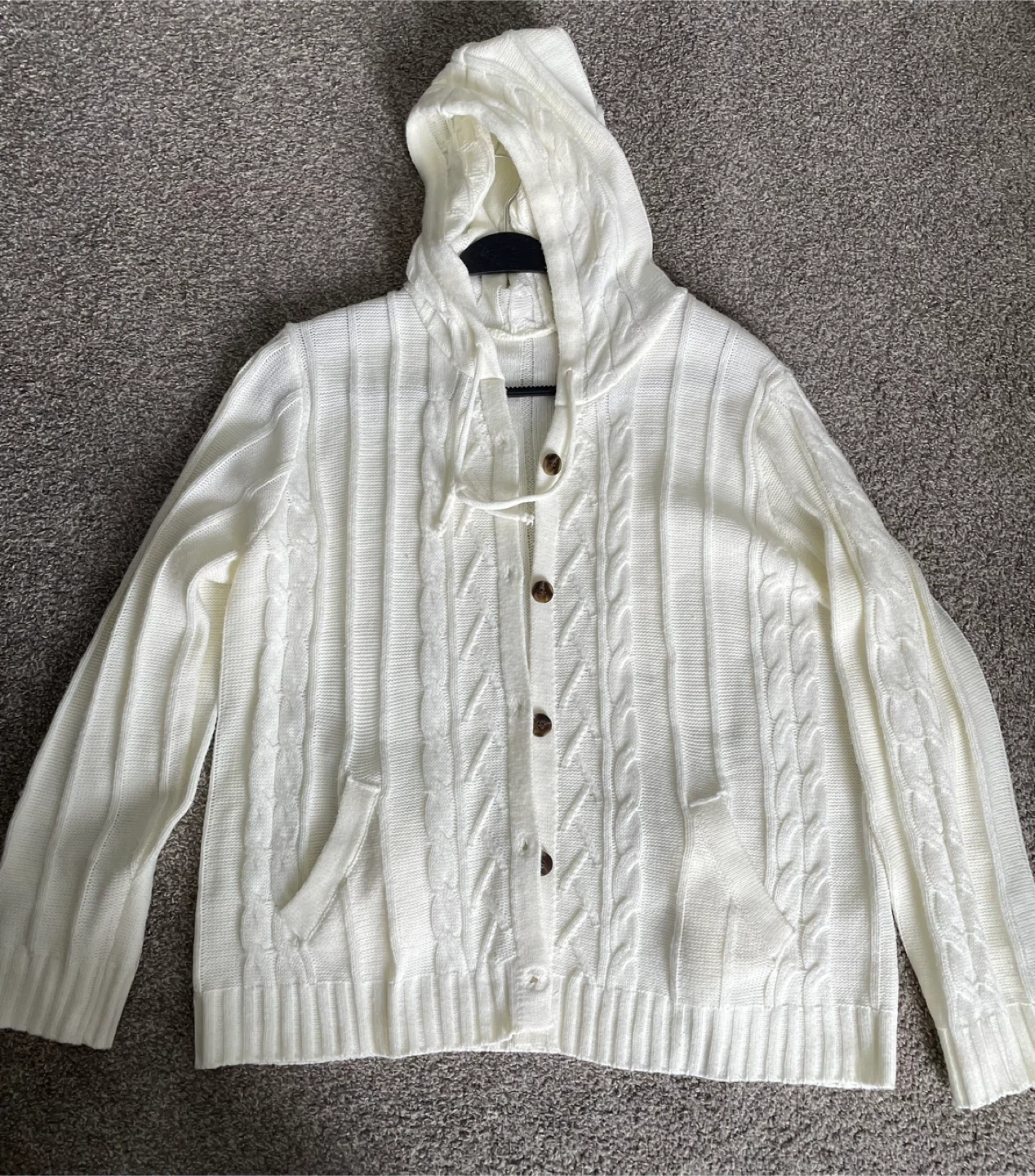 Cozy vintage white cable knit hooded cardigan with brown button front and pockets. The knit is soft and comfortable. Xxl but fits more like a large.