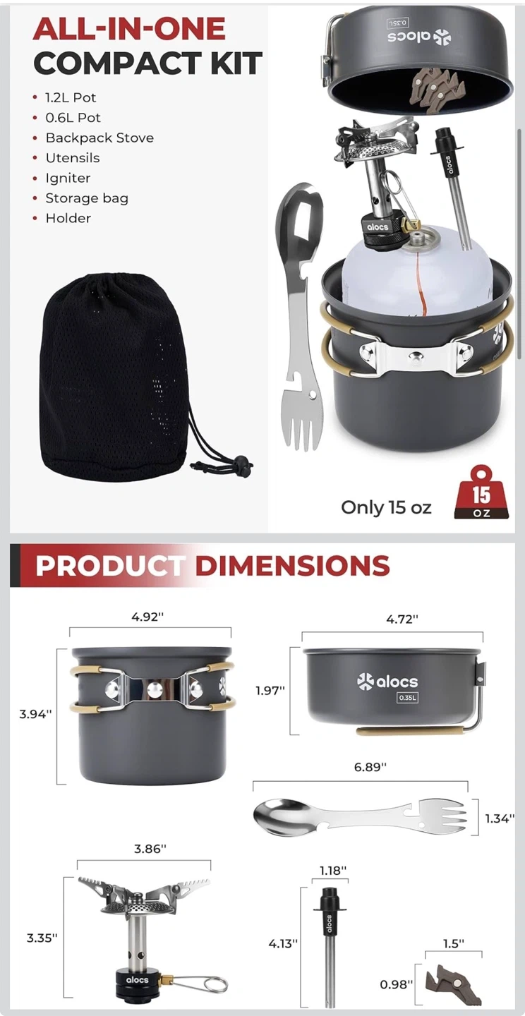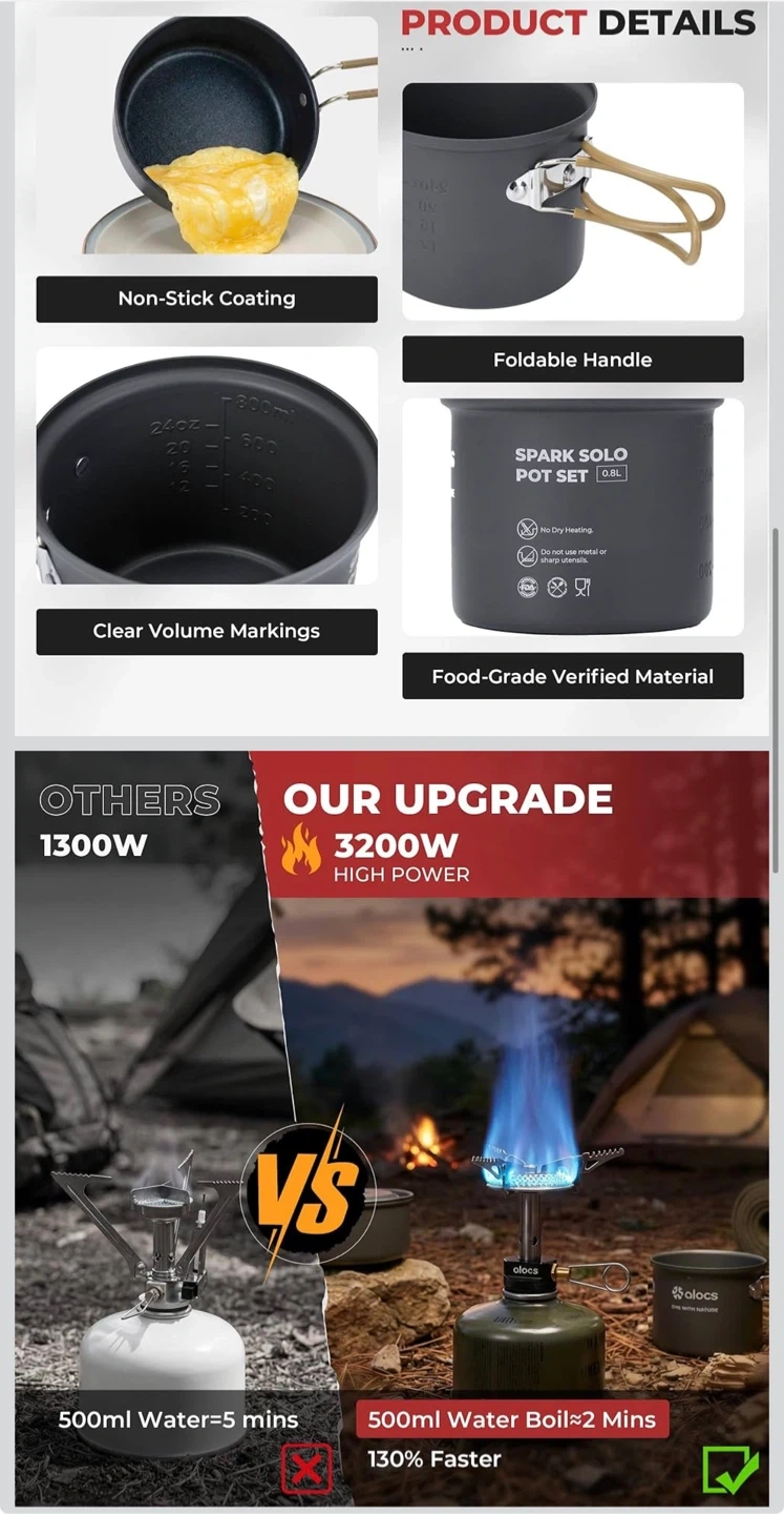 9pcs Camping Cookware Kit, Non-Stick Lightweight Camping Pots with 3200w Stove, Igniter & Gas Canister Stand, 5-in-1 Utility Spork for Hiking, Solo Camping, Backpacking, Outdoor Cooking, Picnic
