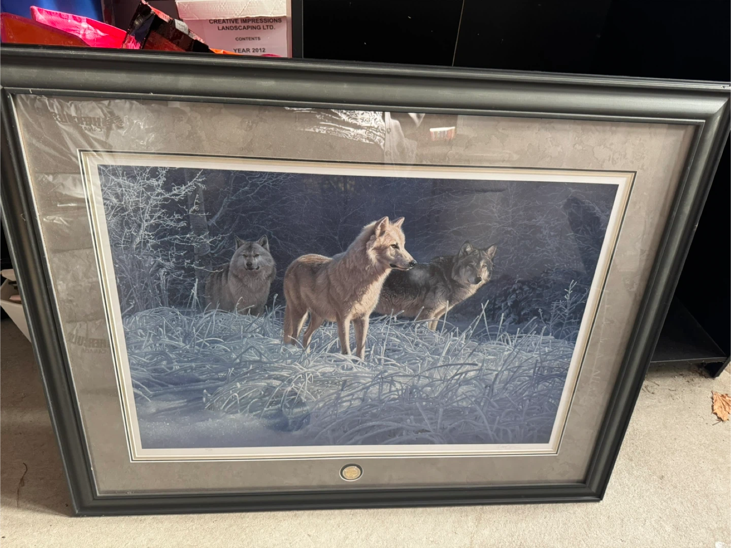 This is a framed print featuring a wolf pack in a snowy scene. The artwork is by "Gary Myers". It's professionally framed and ready to hang. This piece would be a nice addition to a nature-themed decor.