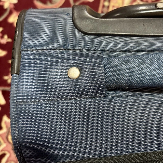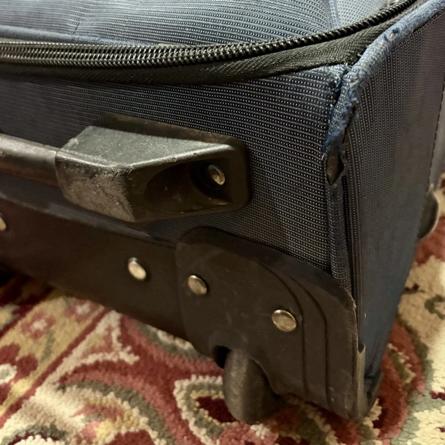 • Telescoping handle extends and retracts smoothly, but does not lock in the down position — it can be lifted without pressing the button. Still usable as-is and can be repaired if desired.