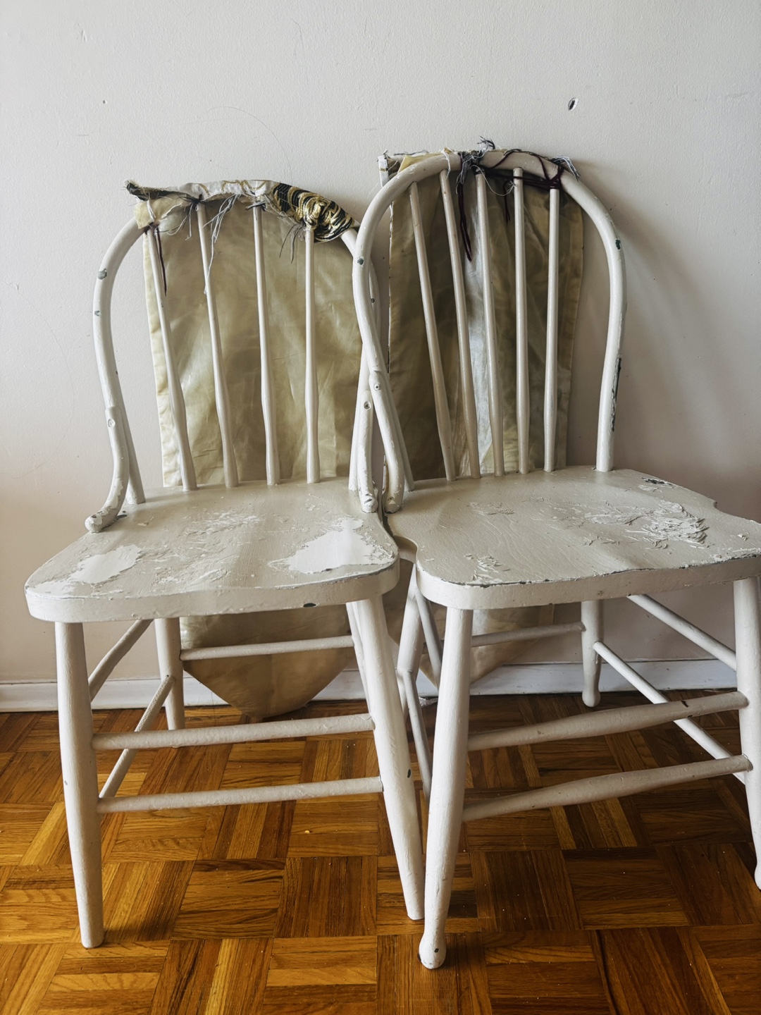 Selling two vintage wooden chairs. They are white and show signs of wear, as pictured. Perfect for a DIY project or to add some rustic charm to your home!🥕