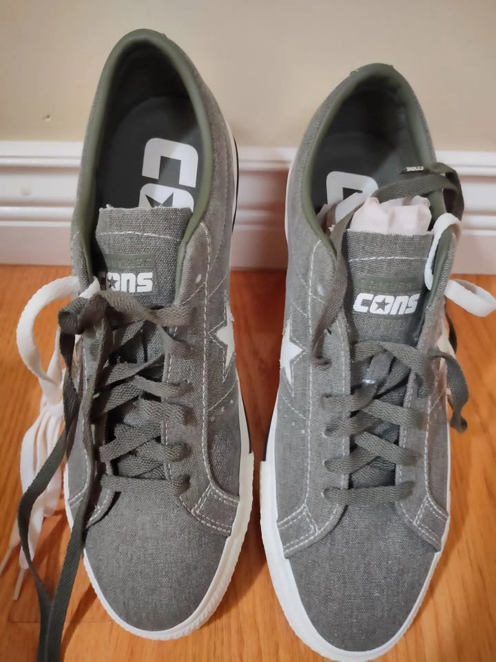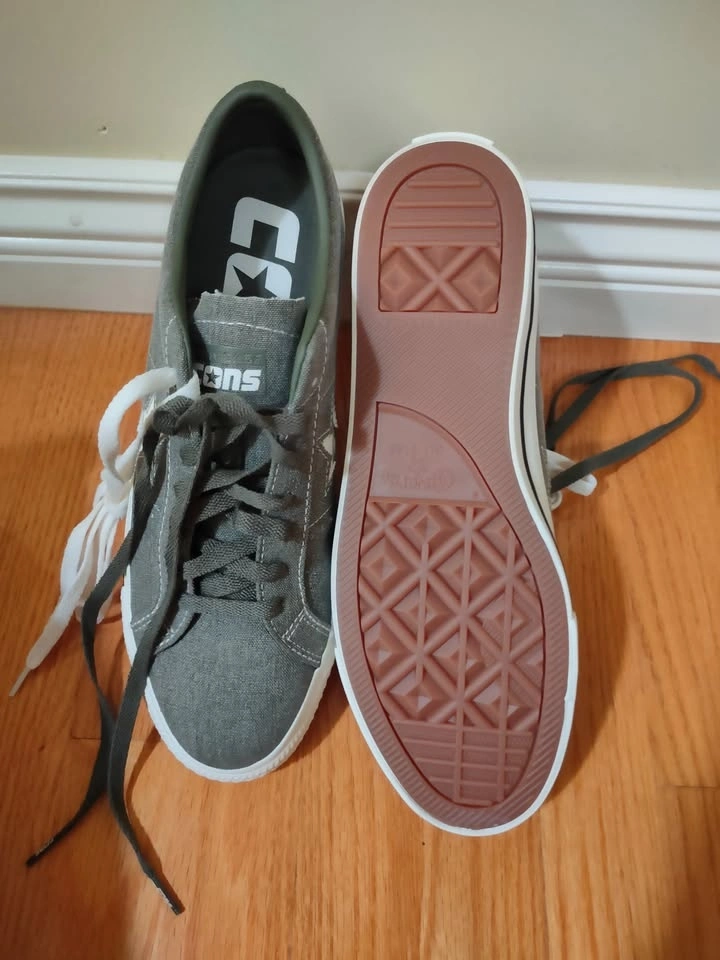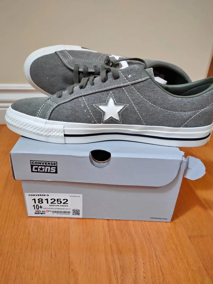 Converse One Star Pro Work wear Utility Sneakers. Never worn, still in the box. Size 10.5M/12W. Box says Medium Green, but they look grey. Pickup near 1st and Renfrew or Broadway-Commercial Skytrain Station area. Asking $60 cash.
