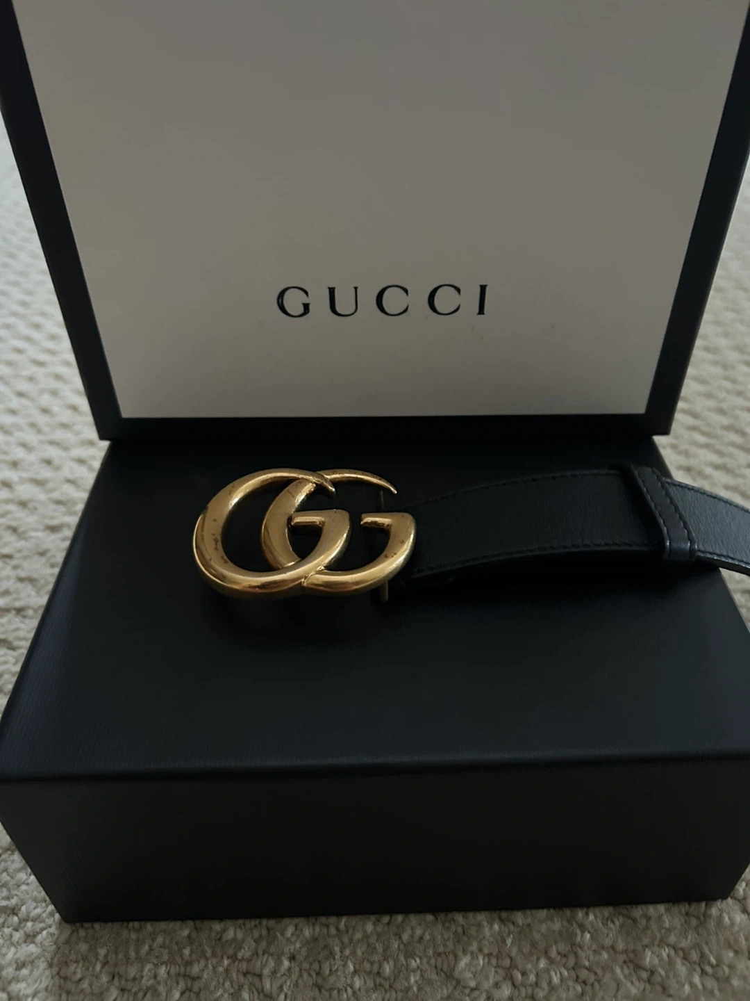Authentic Gucci GG Marmont belt in black leather with iconic antique gold double-G buckle. Classic, timeless piece that works with jeans or dress pants.