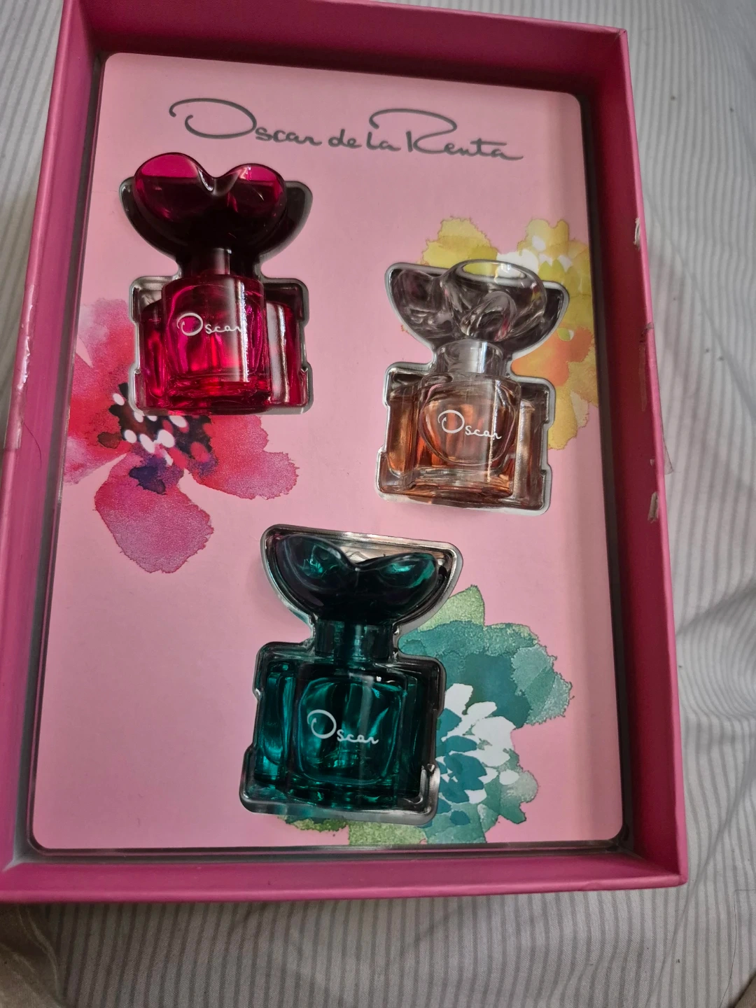 Oscar de la Renta miniature perfume set featuring three distinct scents in colourful glass bottles. This set offers a lovely way to try out different fragrances. Perfect for travel or gifting!