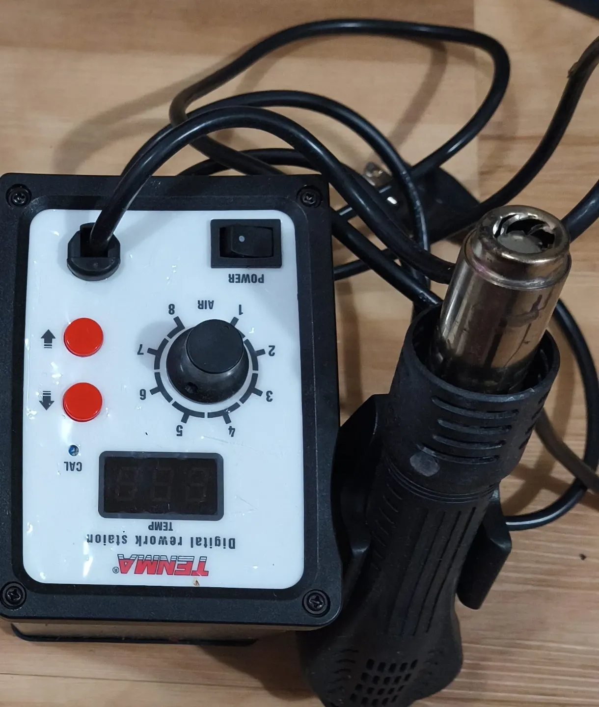 TENMA Digital Rework Station with hot air gun. Features adjustable temperature and air flow control. Includes the main unit and hot air handle.