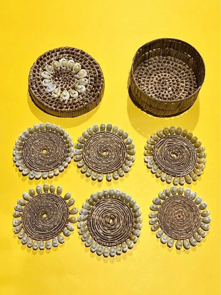 One woven basket container with shell detailing. Six woven coasters, each bordered with white shells for a coastal touch. Ideal for Boho or beach-themed decor, or for hosting guests in style. Pickup weekdays in Ajax or weekends at Yonge & Eglinton.