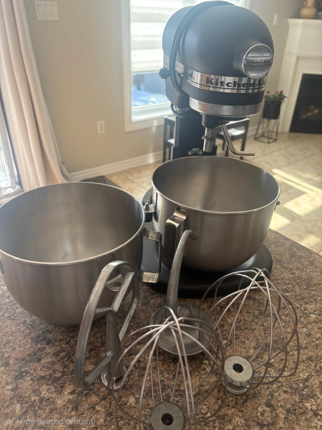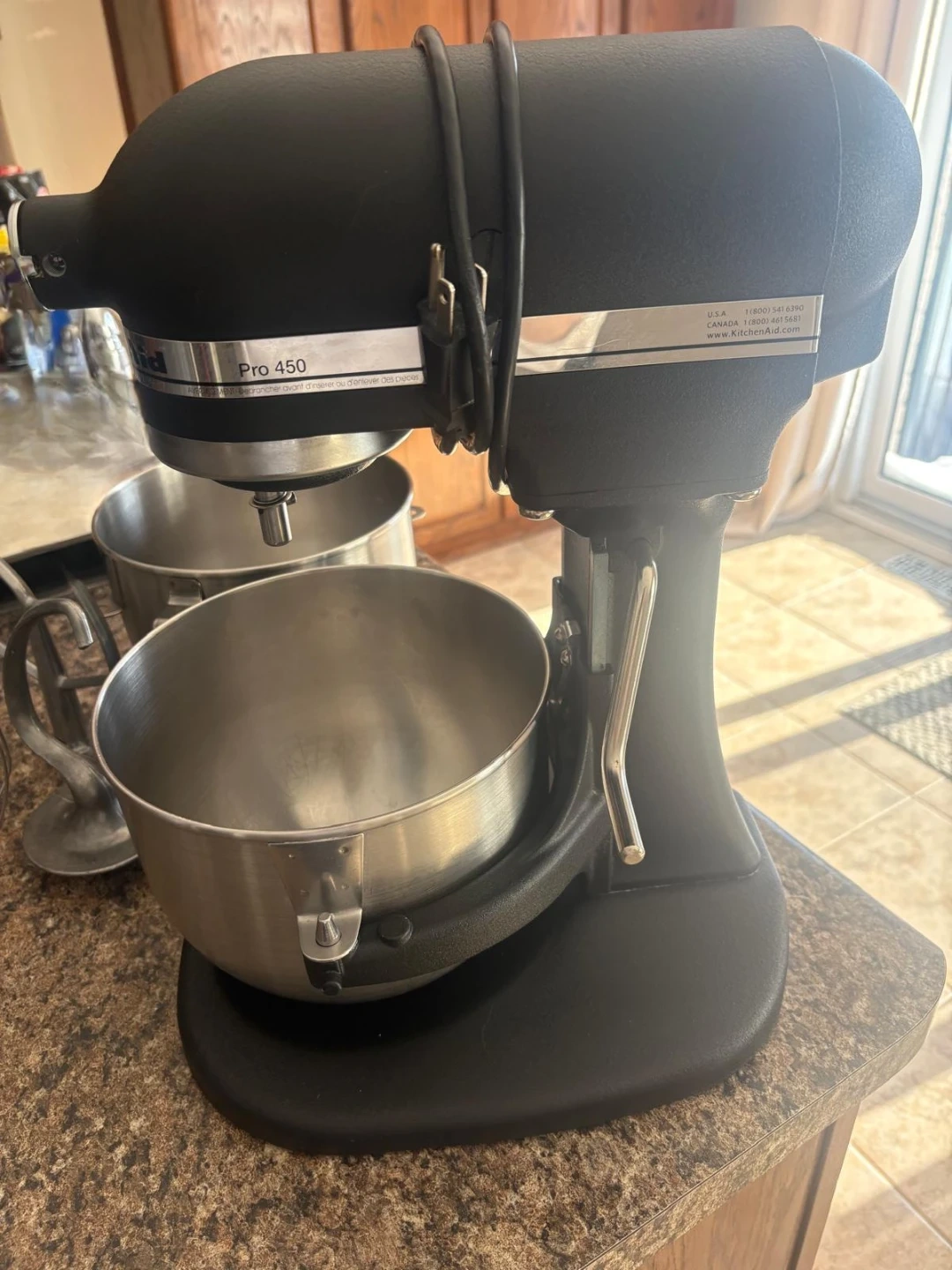 KitchenAid Pro 450 stand mixer in black. It includes two stainless steel bowls, a flat beater, two wire whip, and a dough hook. This mixer is great for all your baking needs!