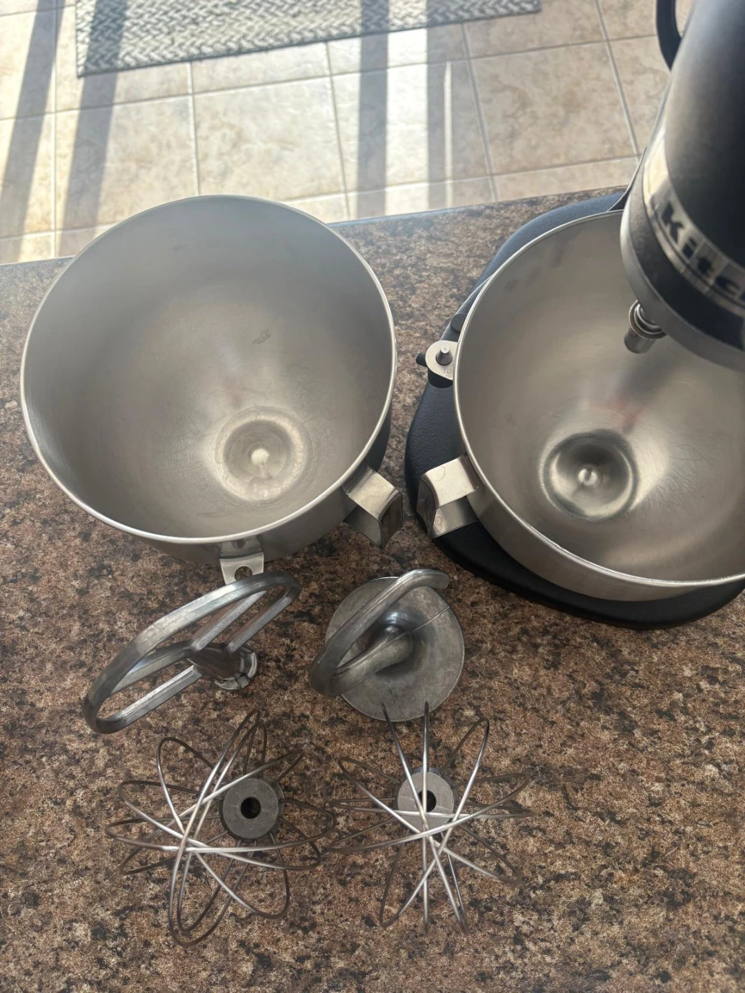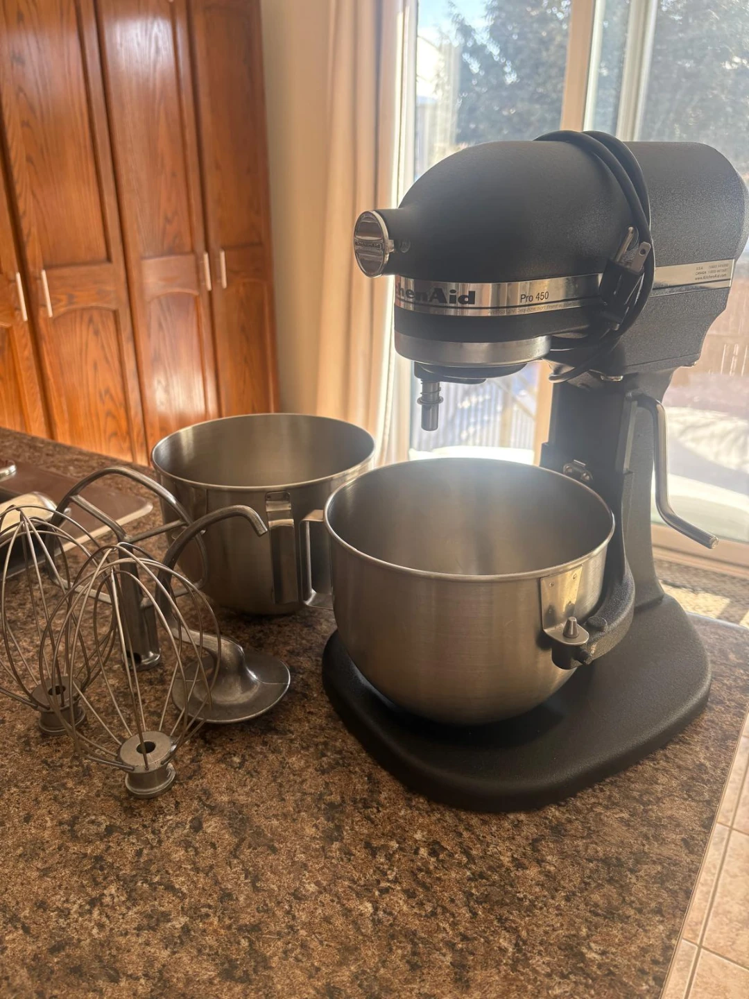 KitchenAid Pro 450 stand mixer in black. It includes two stainless steel bowls, a flat beater, two wire whip, and a dough hook. This mixer is great for all your baking needs!