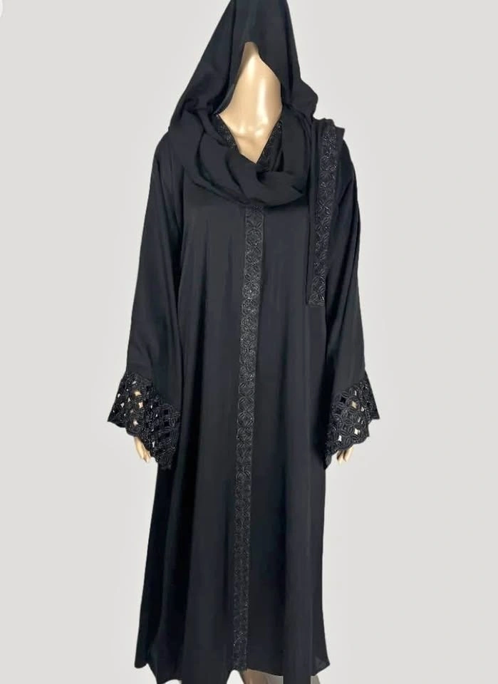 Crafted from luxurious silk, this abaya features intricate laser-cut embroidery on sleeves that adds a modern yet elegant touch. Embroidery on front and scarf of abaya, perfect for any occasions or elevated everyday style. Fabric silk, laser cutting embroidery on sleeves, black color, open front with buttons, 55 inches length. Head scarf included.