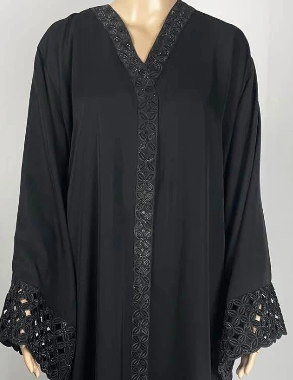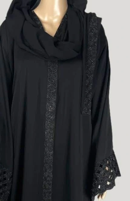 Crafted from luxurious silk, this abaya features intricate laser-cut embroidery on sleeves that adds a modern yet elegant touch. Embroidery on front and scarf of abaya, perfect for any occasions or elevated everyday style. Fabric silk, laser cutting embroidery on sleeves, black color, open front with buttons, 55 inches length. Head scarf included.