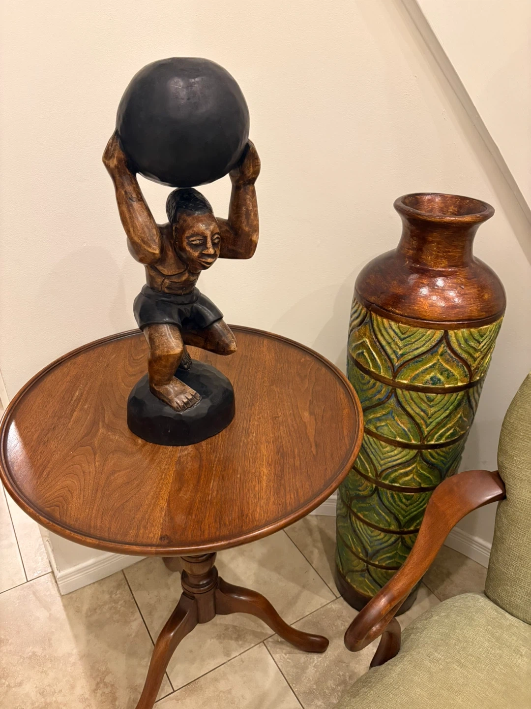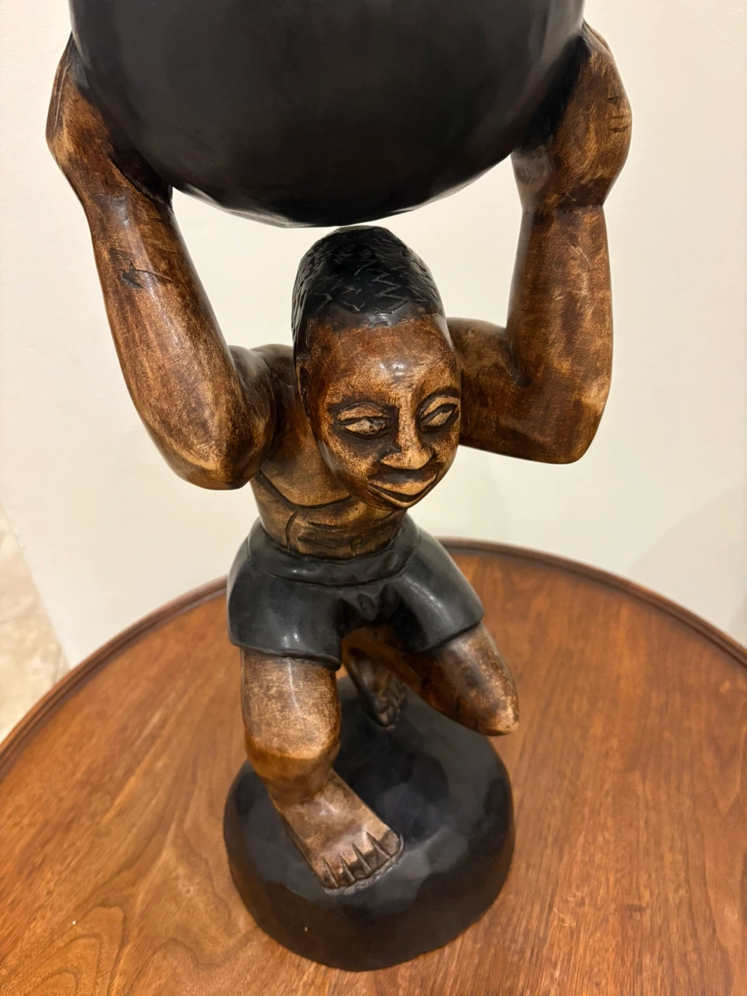 A decorative carved wooden sculpture of a figure supporting a dark sphere. It's made from wood with a rich brown finish. This unique piece would make an interesting addition to a shelf or table.