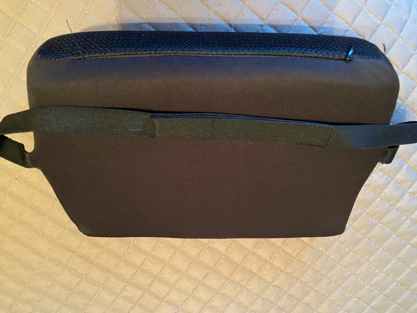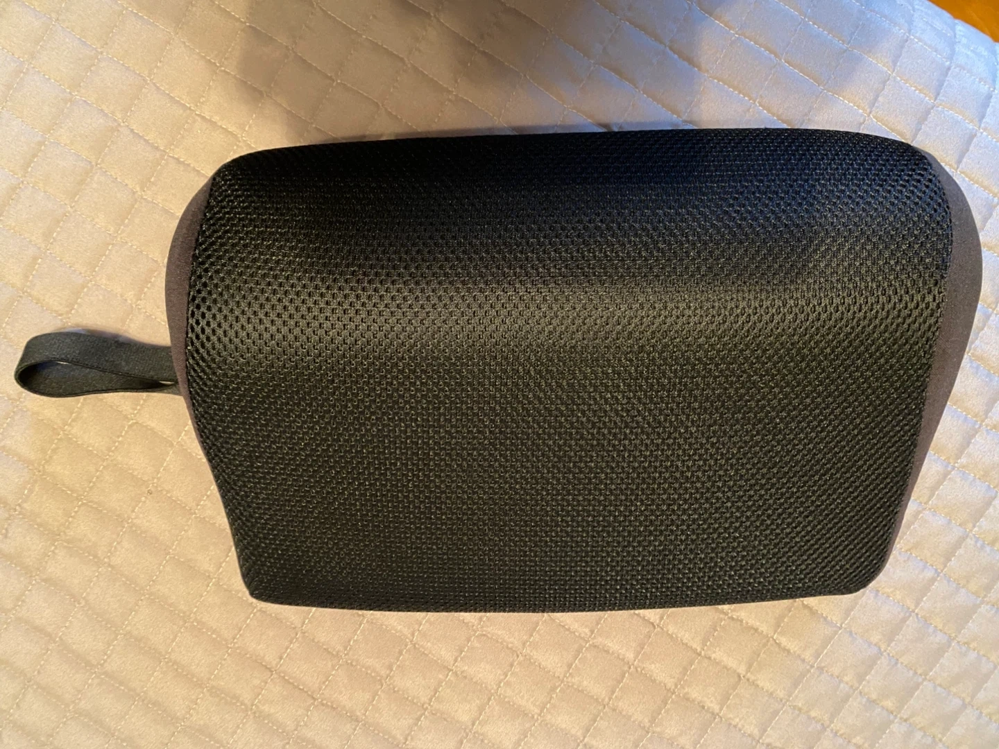 Next to new this black lumbar support pillow provides comfort and helps improve posture. It features a breathable mesh front and a strap for secure attachment to chairs. Its contoured shape offers good lower back support. This pillow is suitable for use on office chairs or car seats.