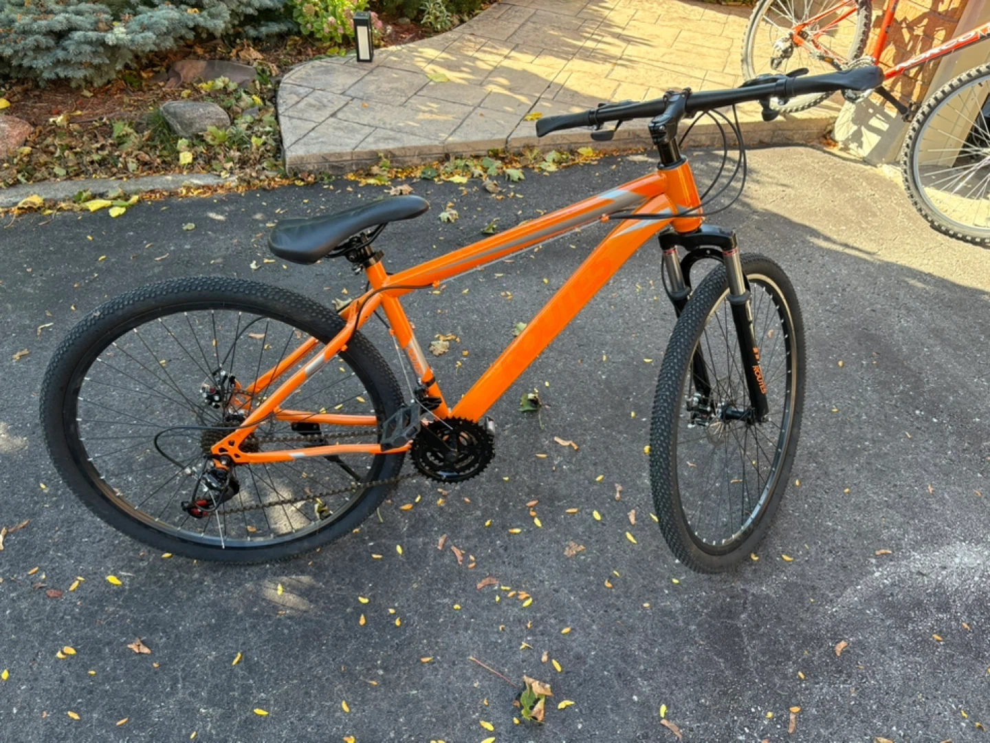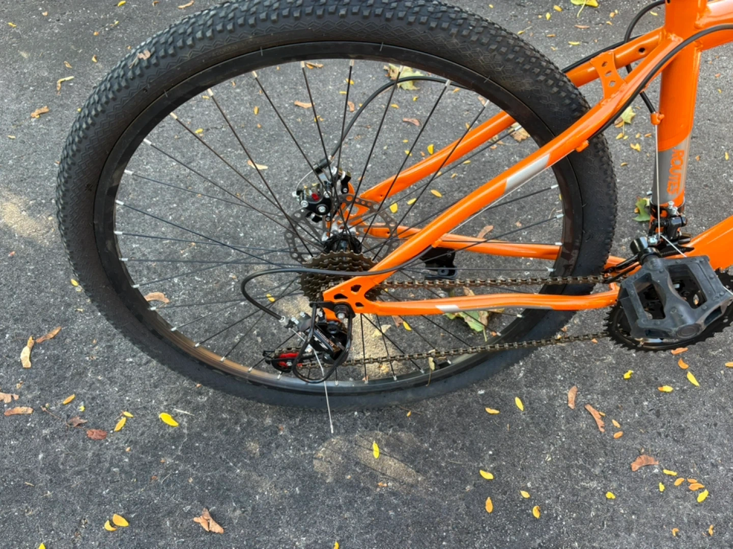 This is an orange Routes mountain bike. It features front suspension and disc brakes. This bike would be good for recreational trail riding.