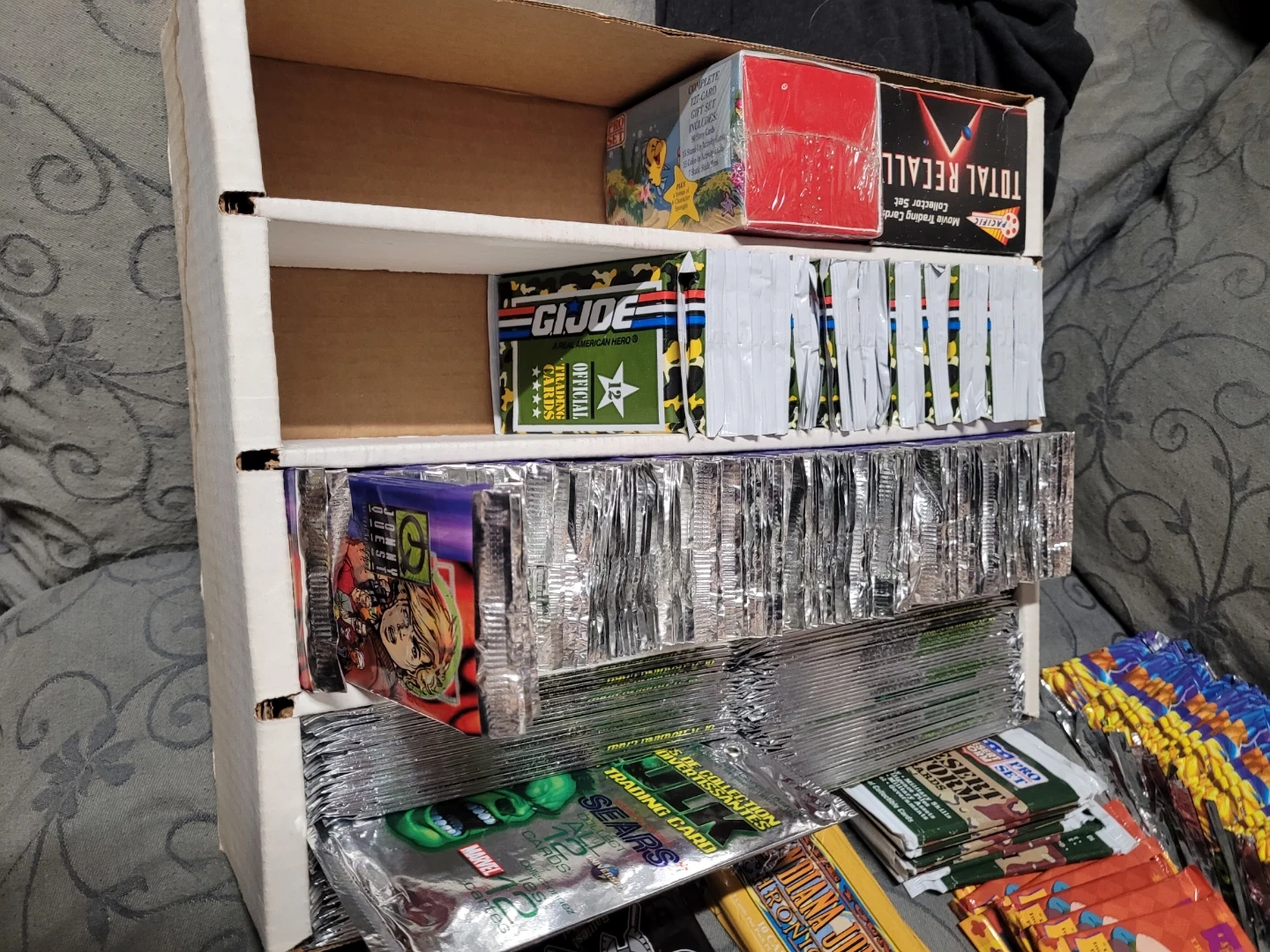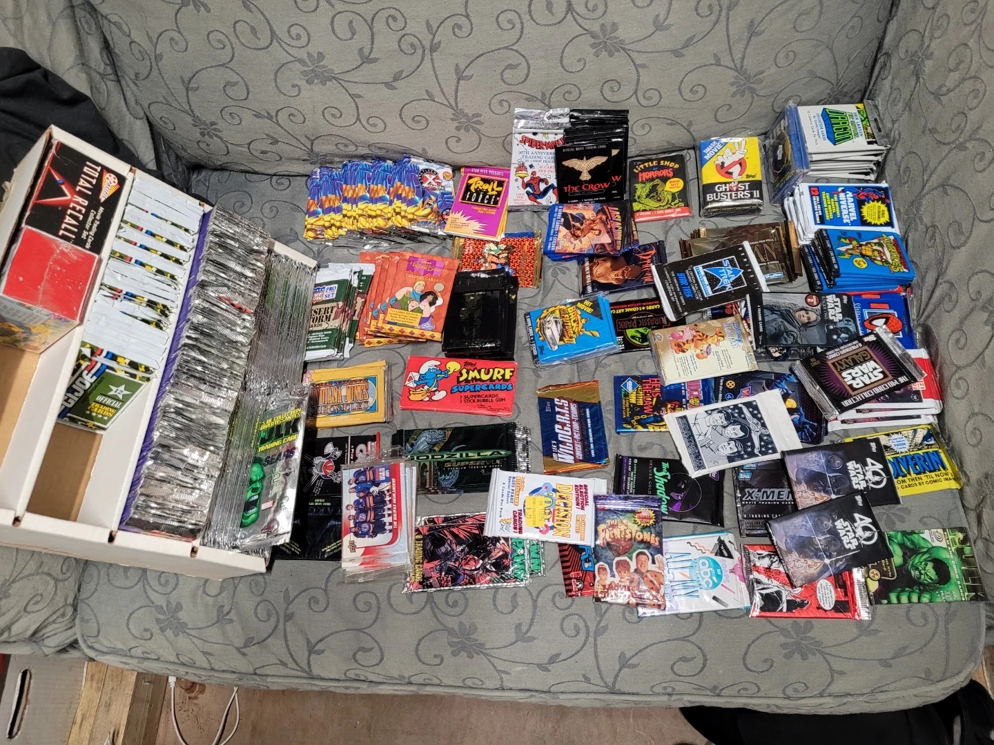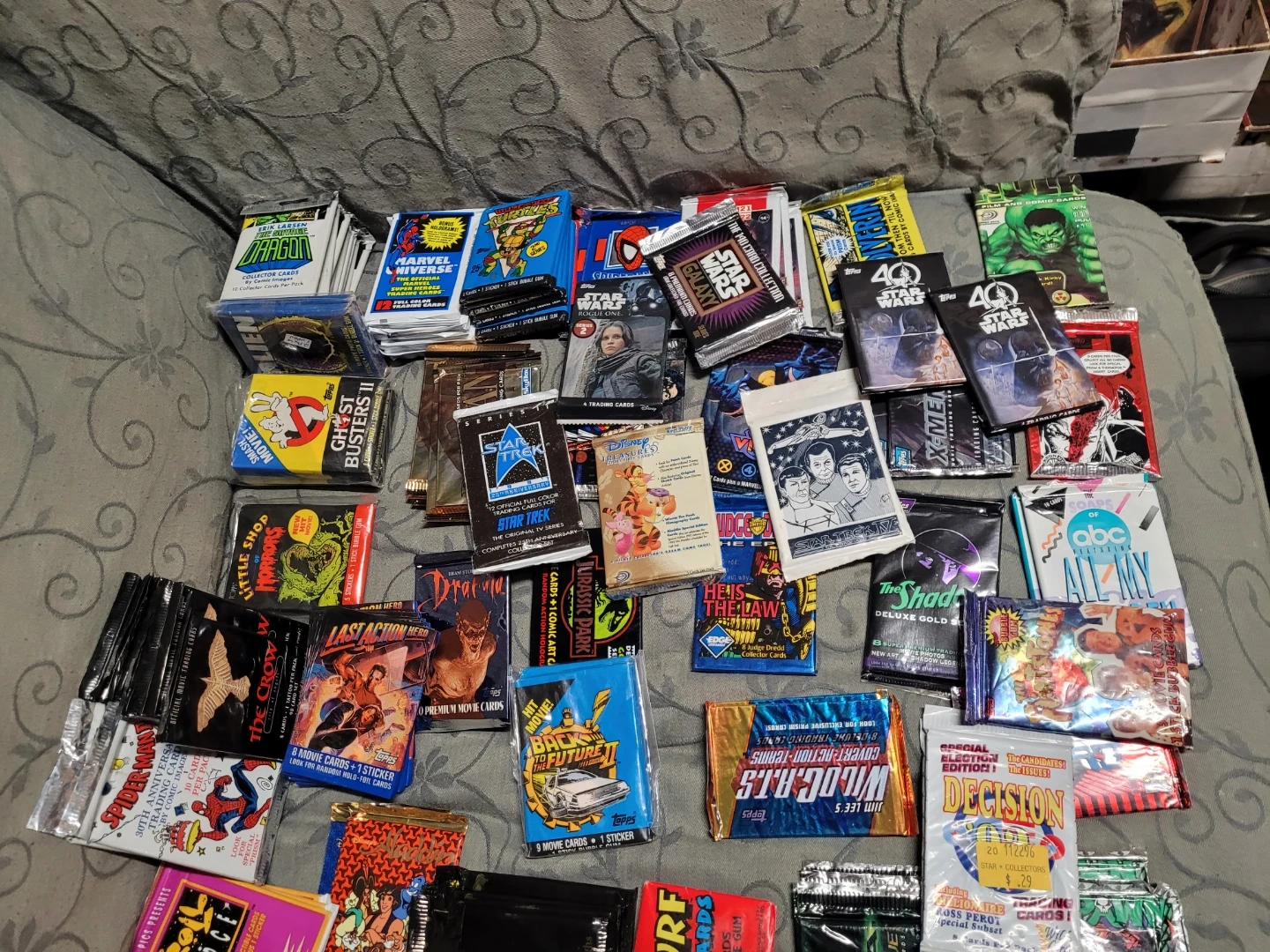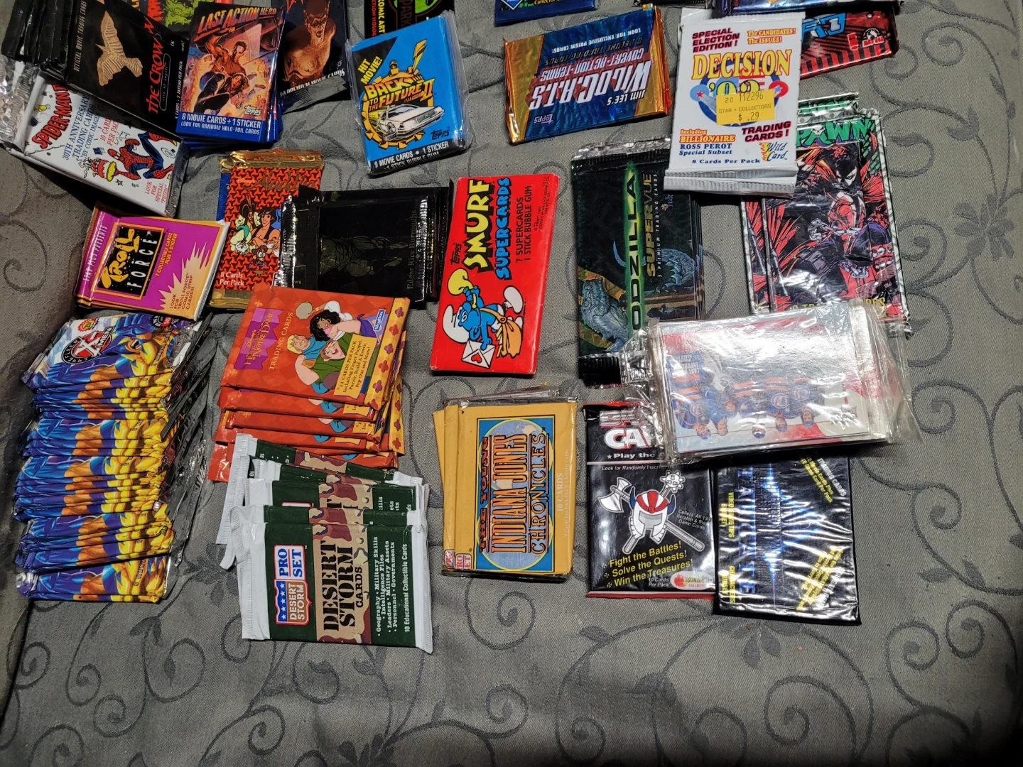 Collection of assorted trading card packs, featuring various franchises like Star Wars, G.I. Joe, Smurfs, and more. Includes packs such as Skybox, Topps, and others. Great for collectors! Prices vary per package