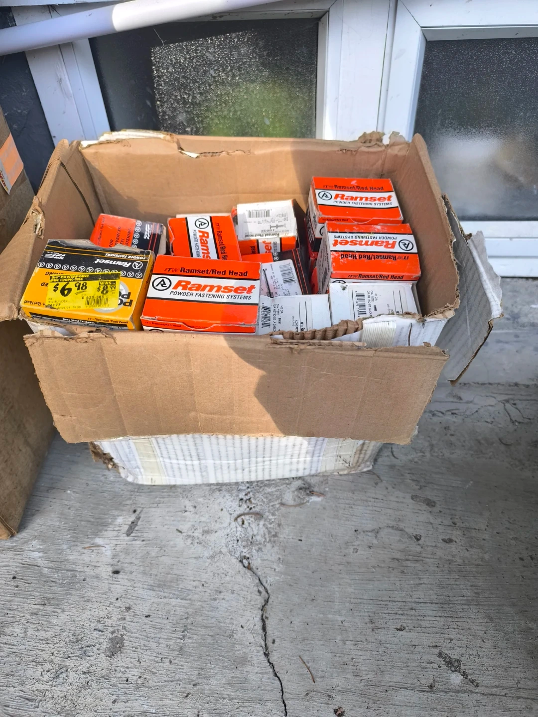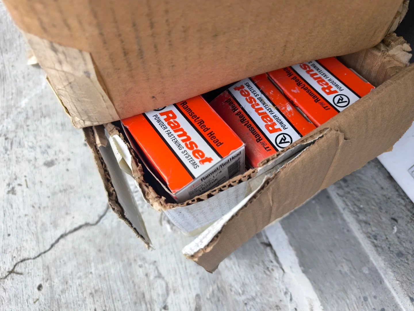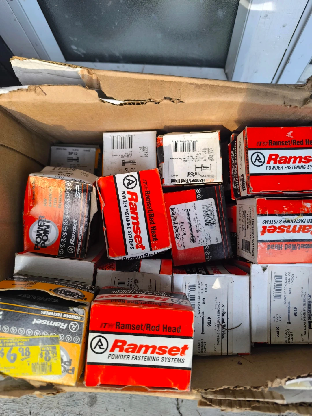 Five Ramset powder actuated fastening tools are included with a large assortment of fasteners. Various boxes of Ramset/Red Head powder fastening systems are also present.