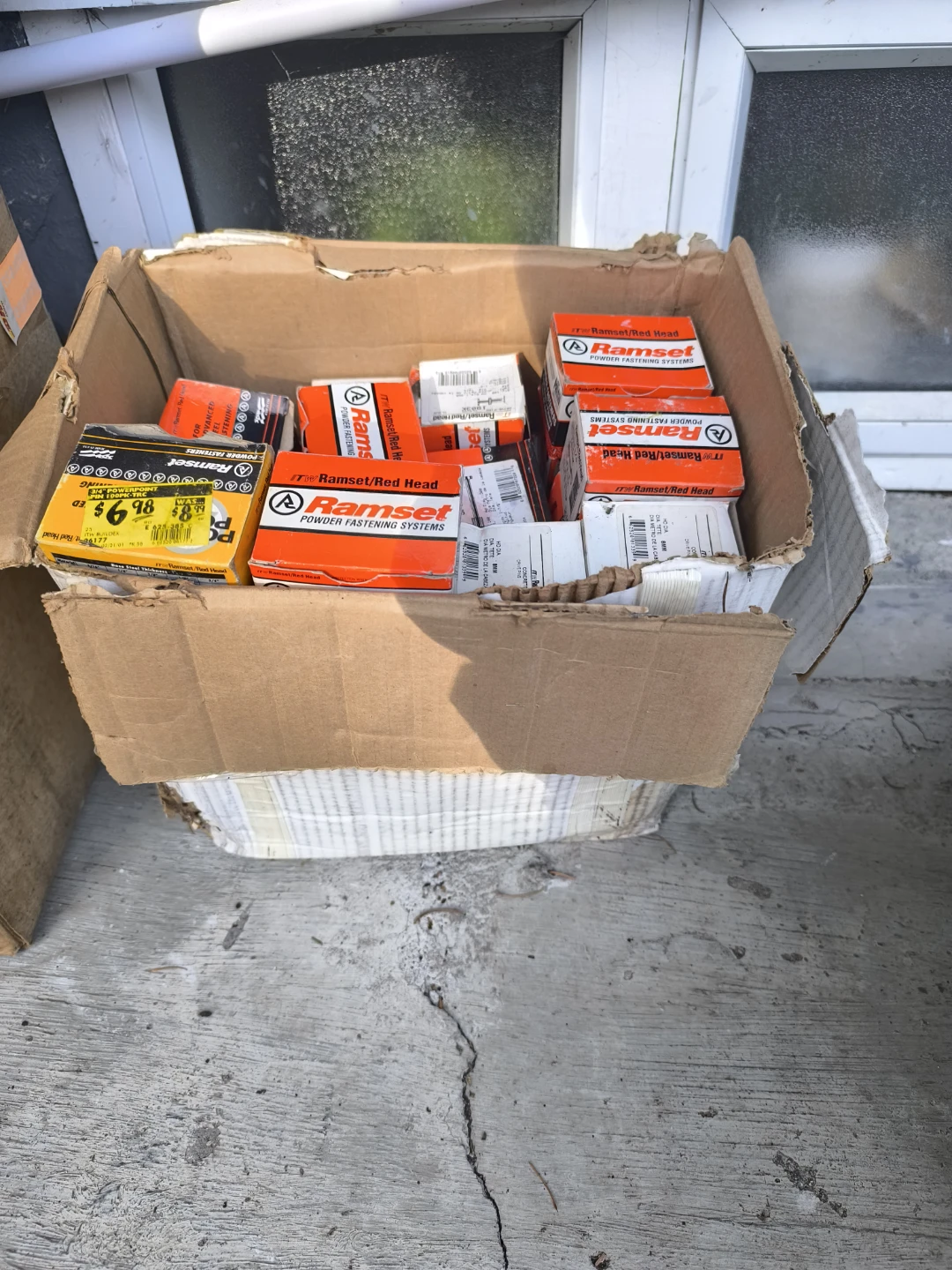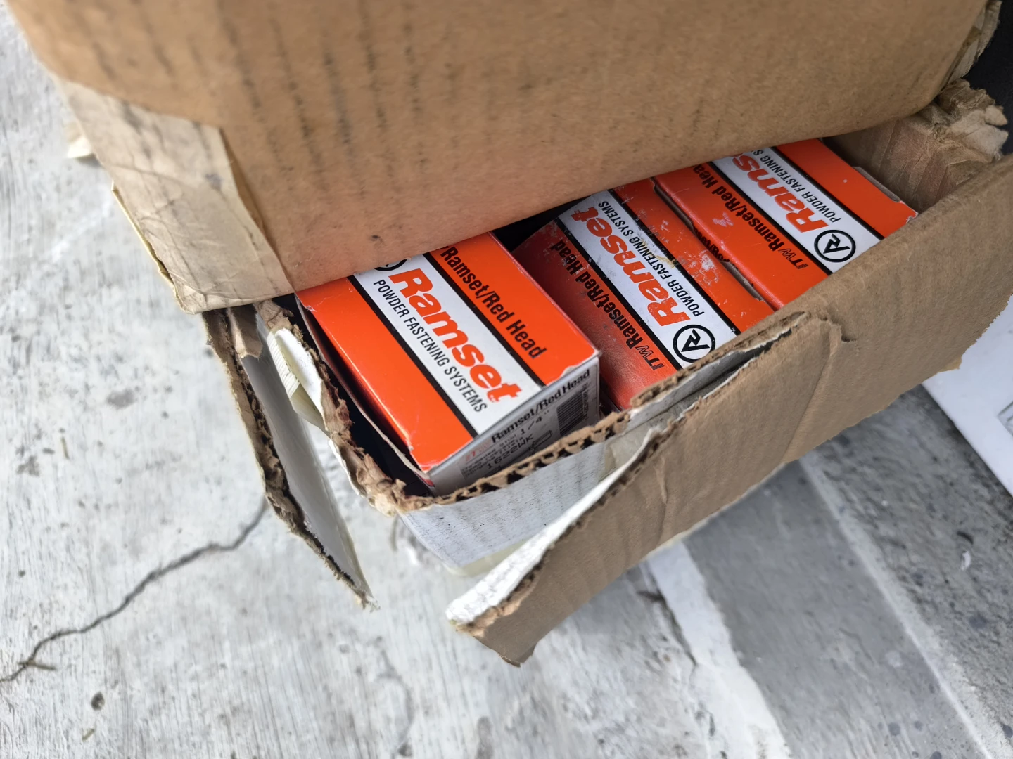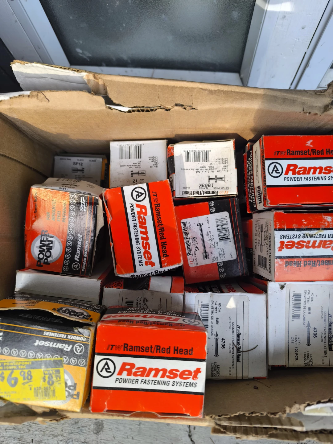 Five Ramset powder actuated fastening tools are included with a large assortment of fasteners. Various boxes of Ramset/Red Head powder fastening systems are also present.