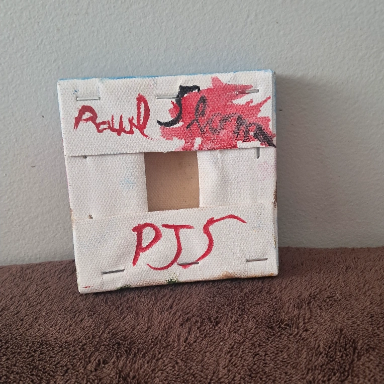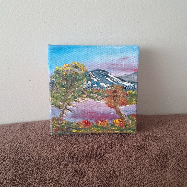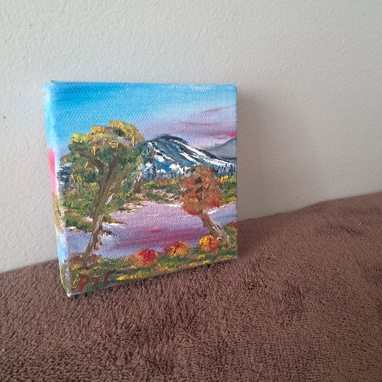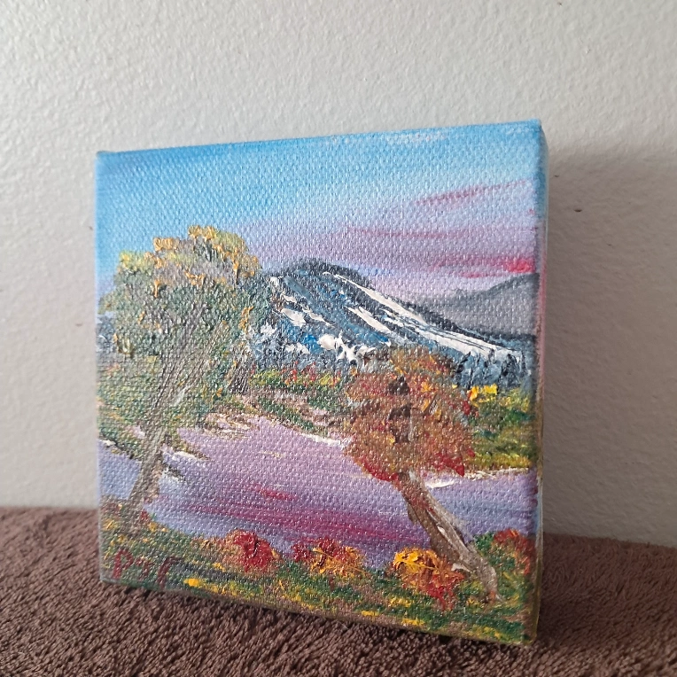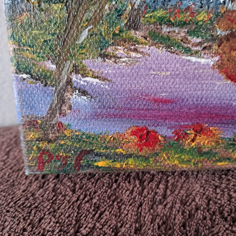 Small original oil painting on canvas. Signed by the artist. Depicts a landscape scene with trees, mountains, and water.