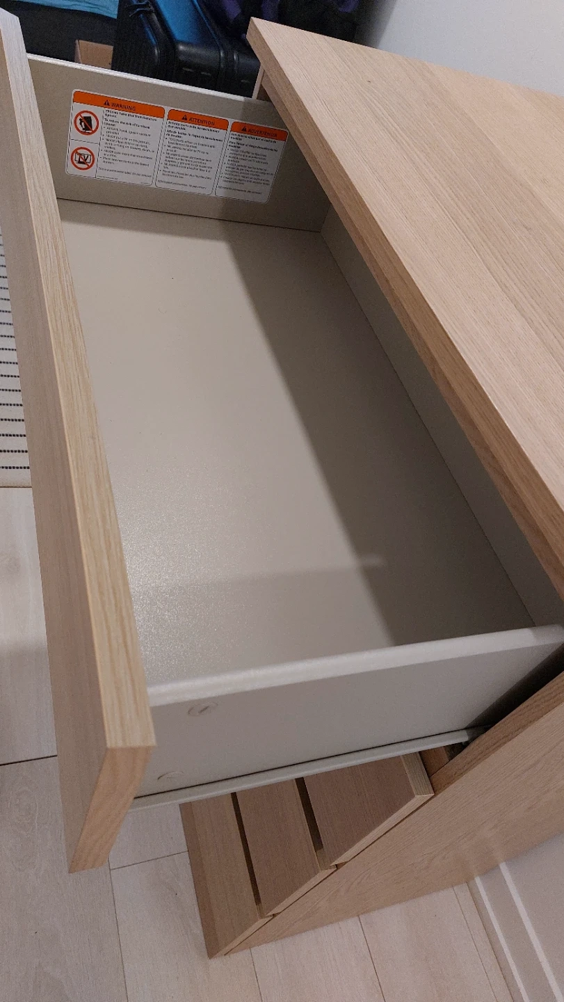 This dresser has a light wood finish and four drawers. The drawers are mounted on metal glides. It's a handy piece for storing clothes or other items.