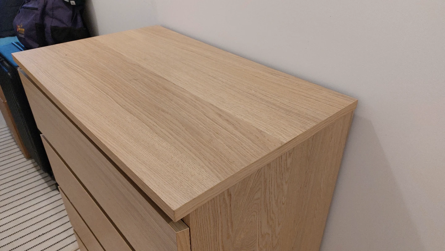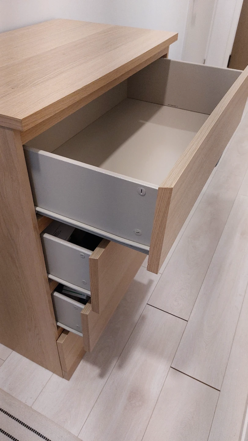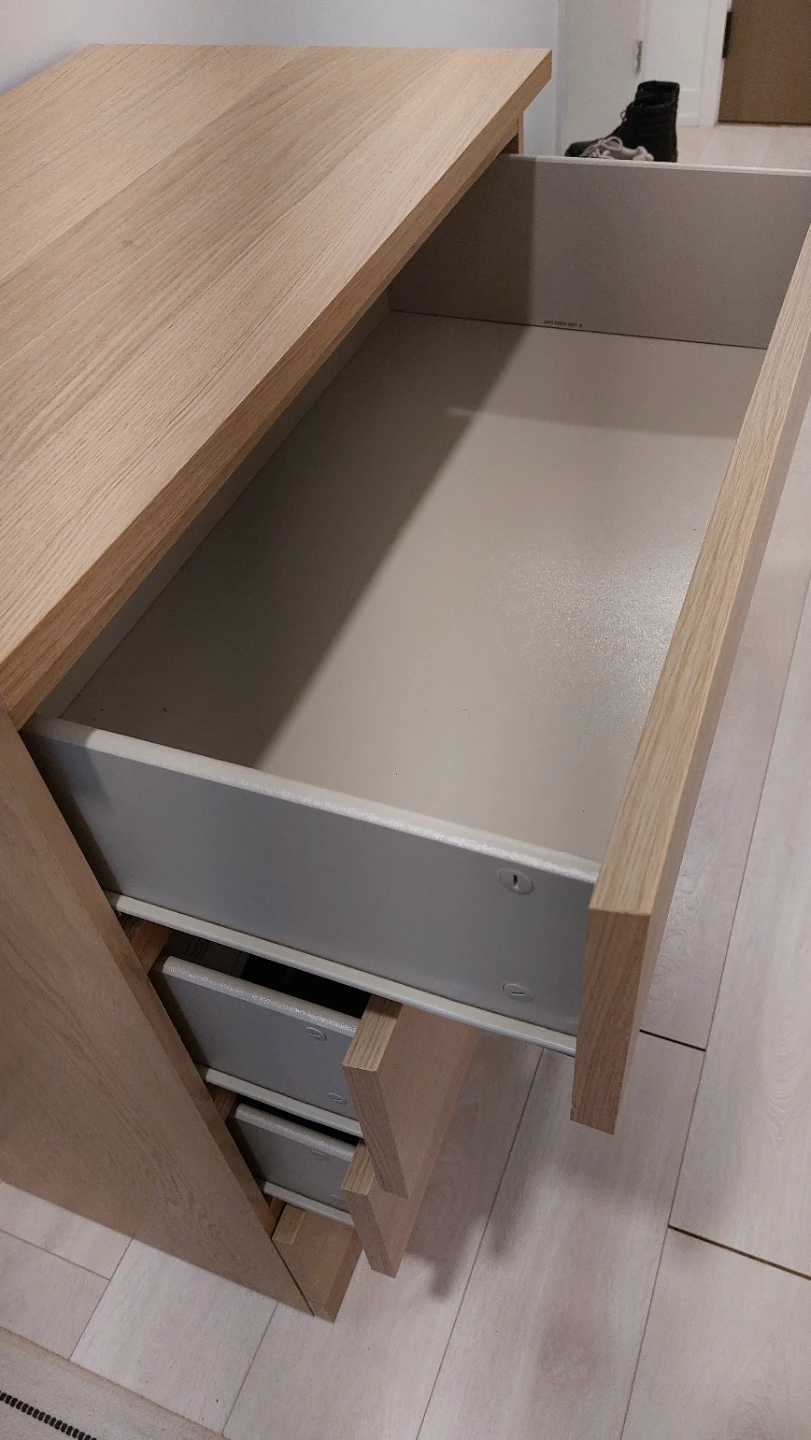 This dresser has a light wood finish and four drawers. The drawers are mounted on metal glides. It's a handy piece for storing clothes or other items.