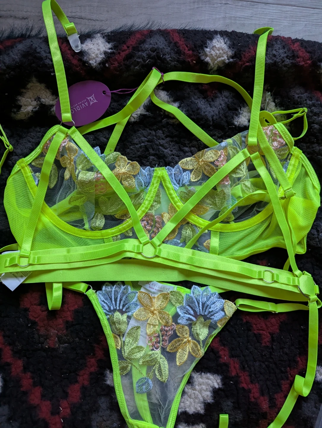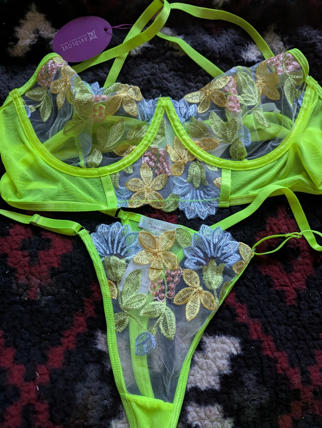 This AVIDLOVE lingerie set features a neon yellow bra and thong with intricate floral embroidery. It's made of sheer mesh material. The straps are adjustable. Adds a bold pop of colour!
