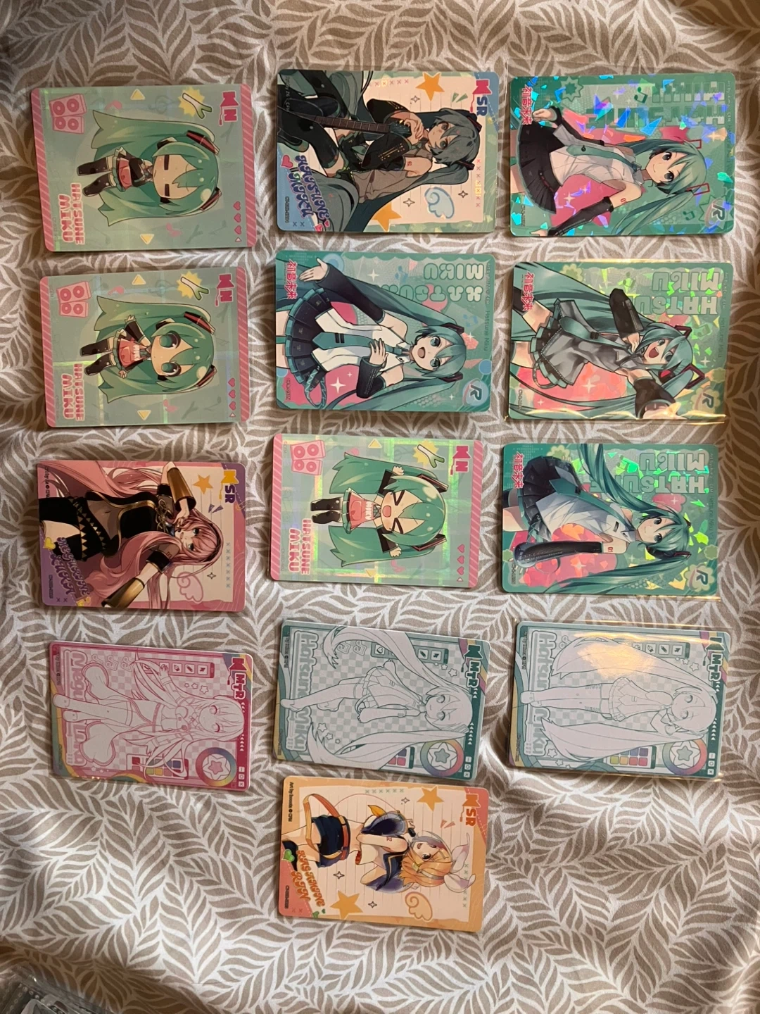 This lot includes several trading cards featuring Hatsune Miku and other Vocaloid characters. Cards show various illustrations and designs. Some cards have holographic or sparkly effects.