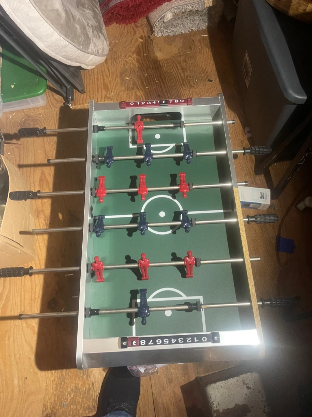 This is a tabletop foosball game with red and blue players. It includes scoring rods on each end of the table. Comes with 2 balls Great for quick games and hours of fun anywhere! Buy it today and play right away!!