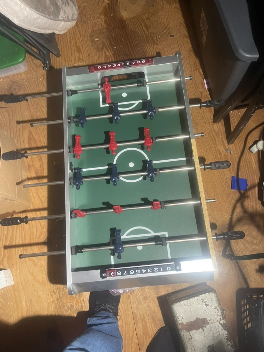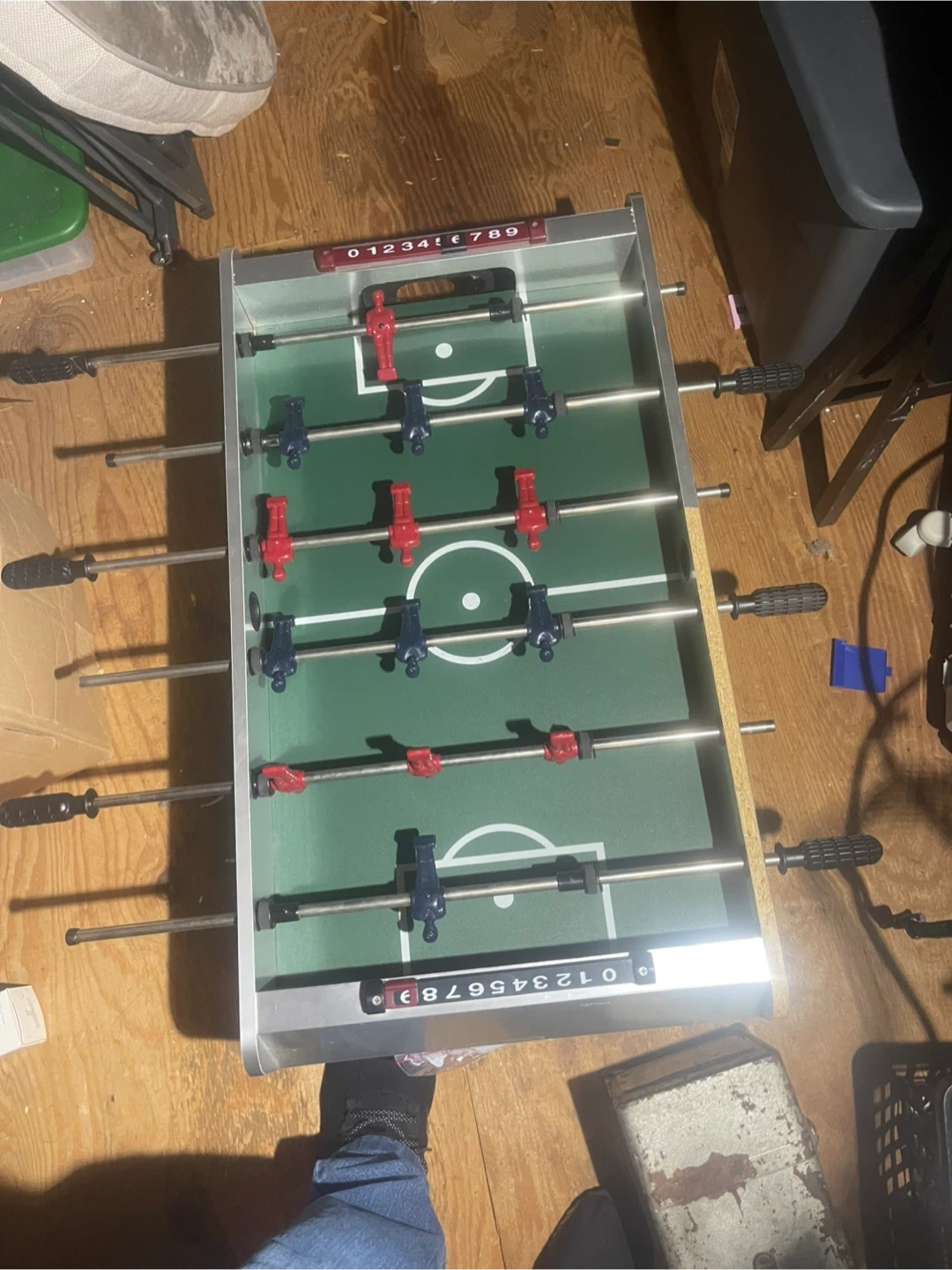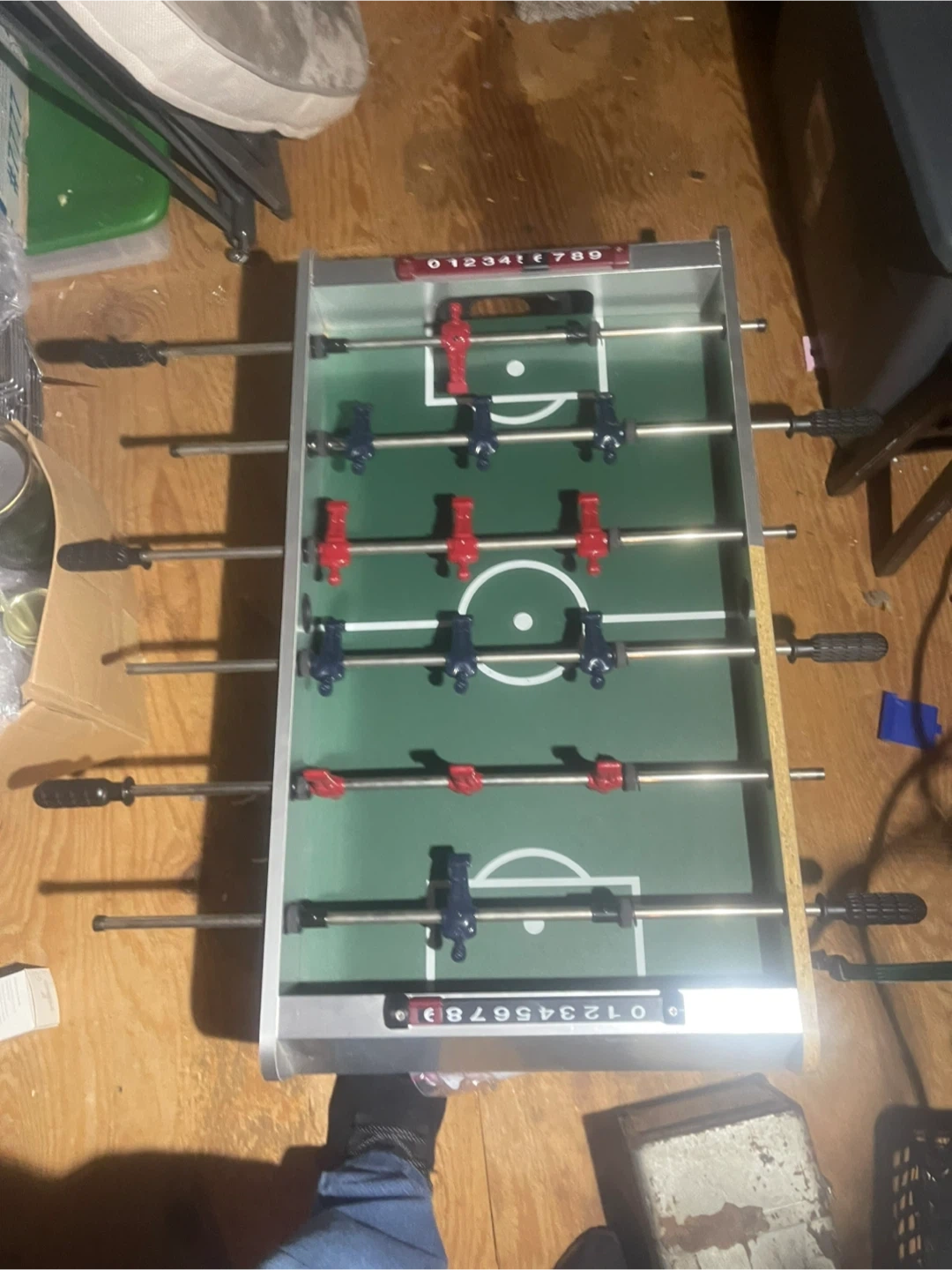 This is a tabletop foosball game with red and blue players. It includes scoring rods on each end of the table. Comes with 2 balls Great for quick games and hours of fun anywhere! Buy it today and play right away!!
