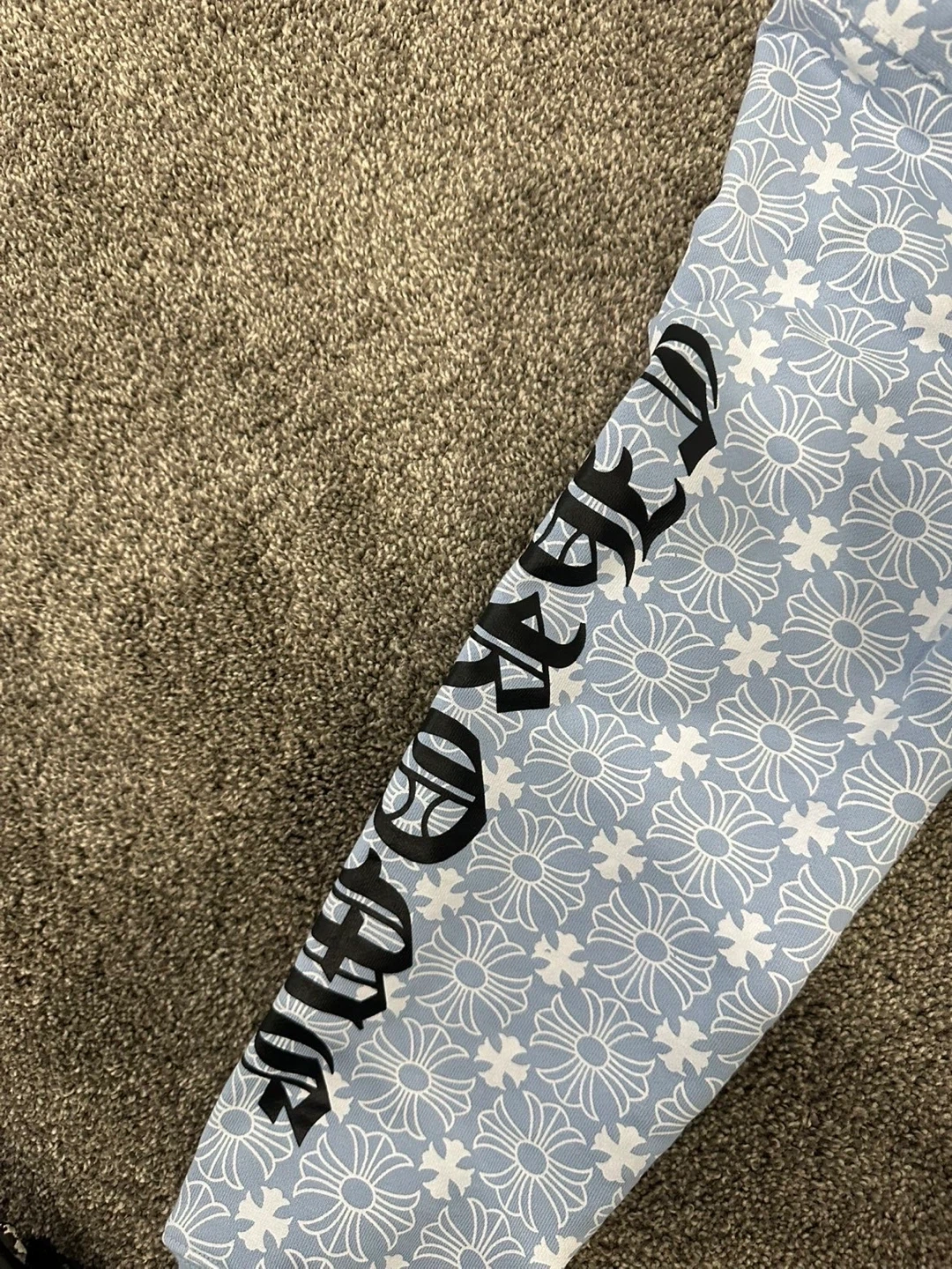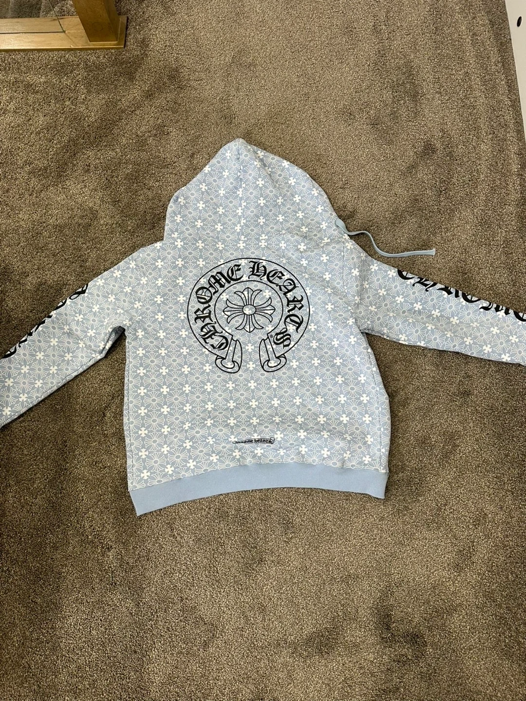This Chrome Hearts zip-up hoodie features a light blue colour with a repeating white floral pattern. It has the iconic Chrome Hearts logo on the chest and sleeve. Made from comfortable material.