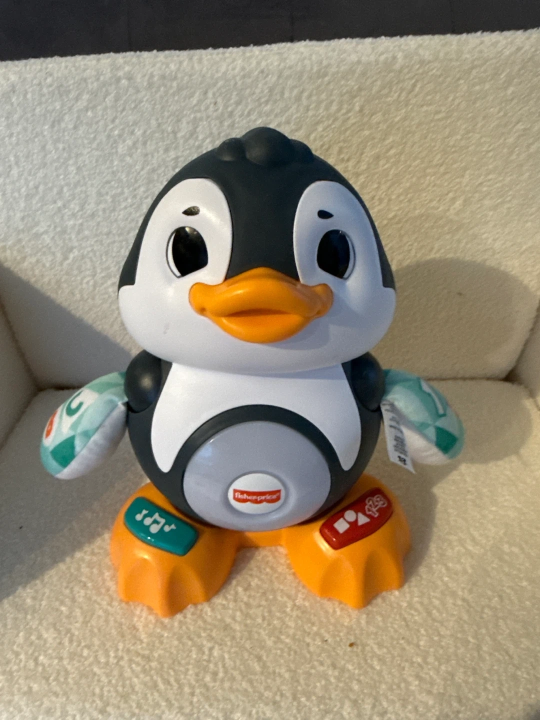 This is a Fisher-Price penguin toy. It has colourful buttons on its feet with musical notes and numbers. The toy is made of plastic with fabric wings. It's designed for babies and toddlers. Fun for little ones learning through play!
