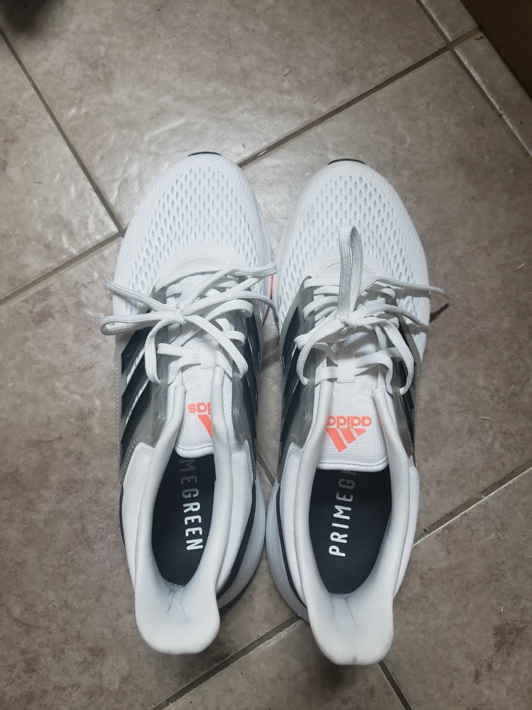 These Adidas running shoes are white with black and coral accents. They feature Primegreen and Primeblue materials for sustainability. Great for daily runs or training!