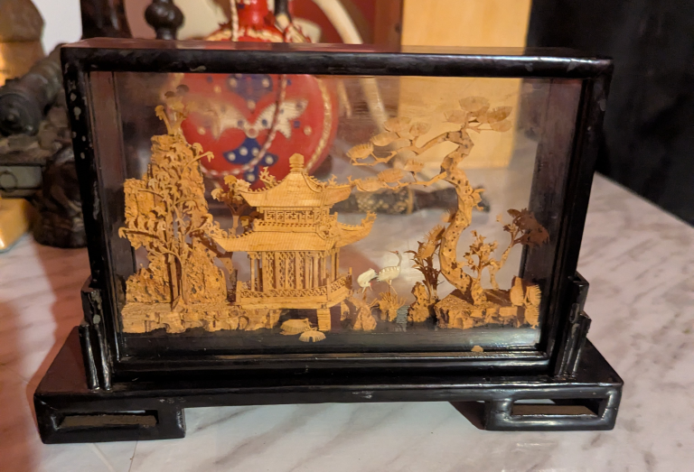 A beautiful vintage display case featuring intricately carved wood inside a glass and wood frame. It's a unique piece that would add a touch of elegance to any room!