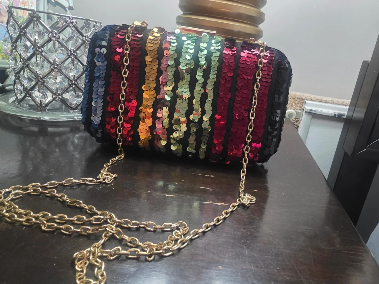 Sparkly clutch bag with a rainbow sequin design. It has a black fabric base and a detachable gold chain strap. Perfect for adding a pop of colour to any evening outfit!