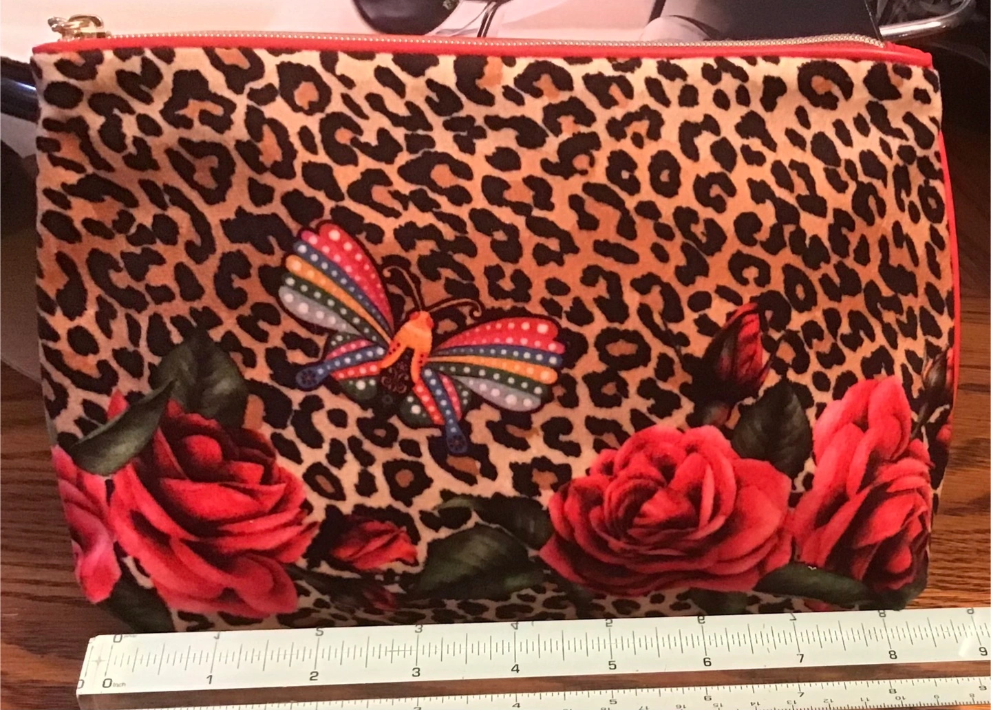 Selling a cute Estée Lauder cosmetic bag with a fun leopard print! It also features a red trim and a butterfly and rose design on one side. Perfect for storing your makeup or toiletries! 🤩