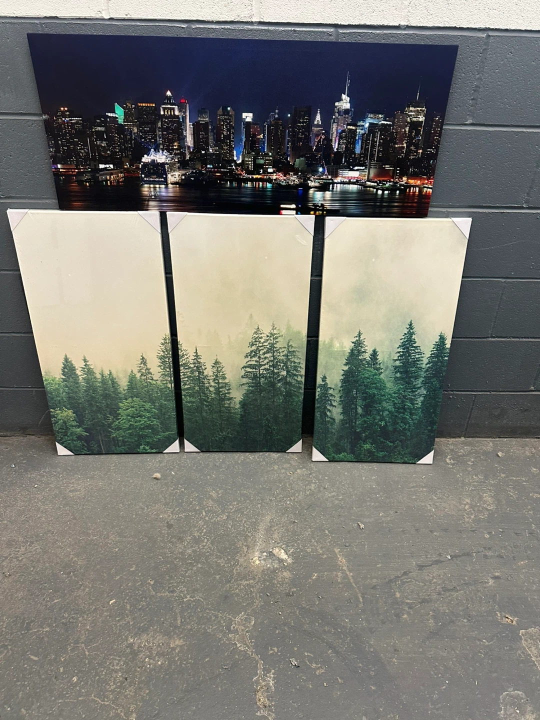 Set includes three canvas prints of a misty forest scene and one large canvas print of a city skyline at night. Ready to hang wall decor for your living space. Adds a touch of nature and urban ambiance to any room!