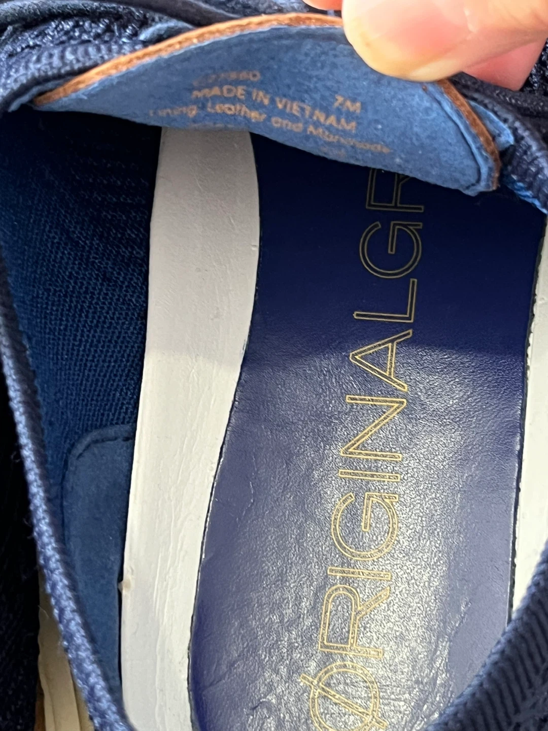 These are blue knit Cole Haan Zerogrand wingtip oxford shoes. They're a men's size 7M and made in Vietnam. The shoes feature a knit upper with leather accents.