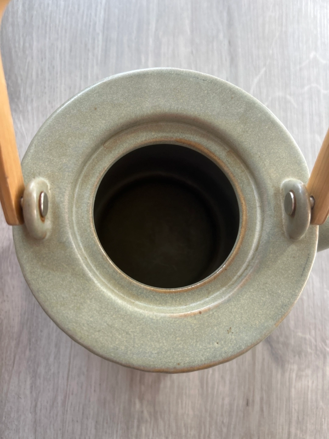 - Ceramic teapot with a light green glaze and a wooden handle