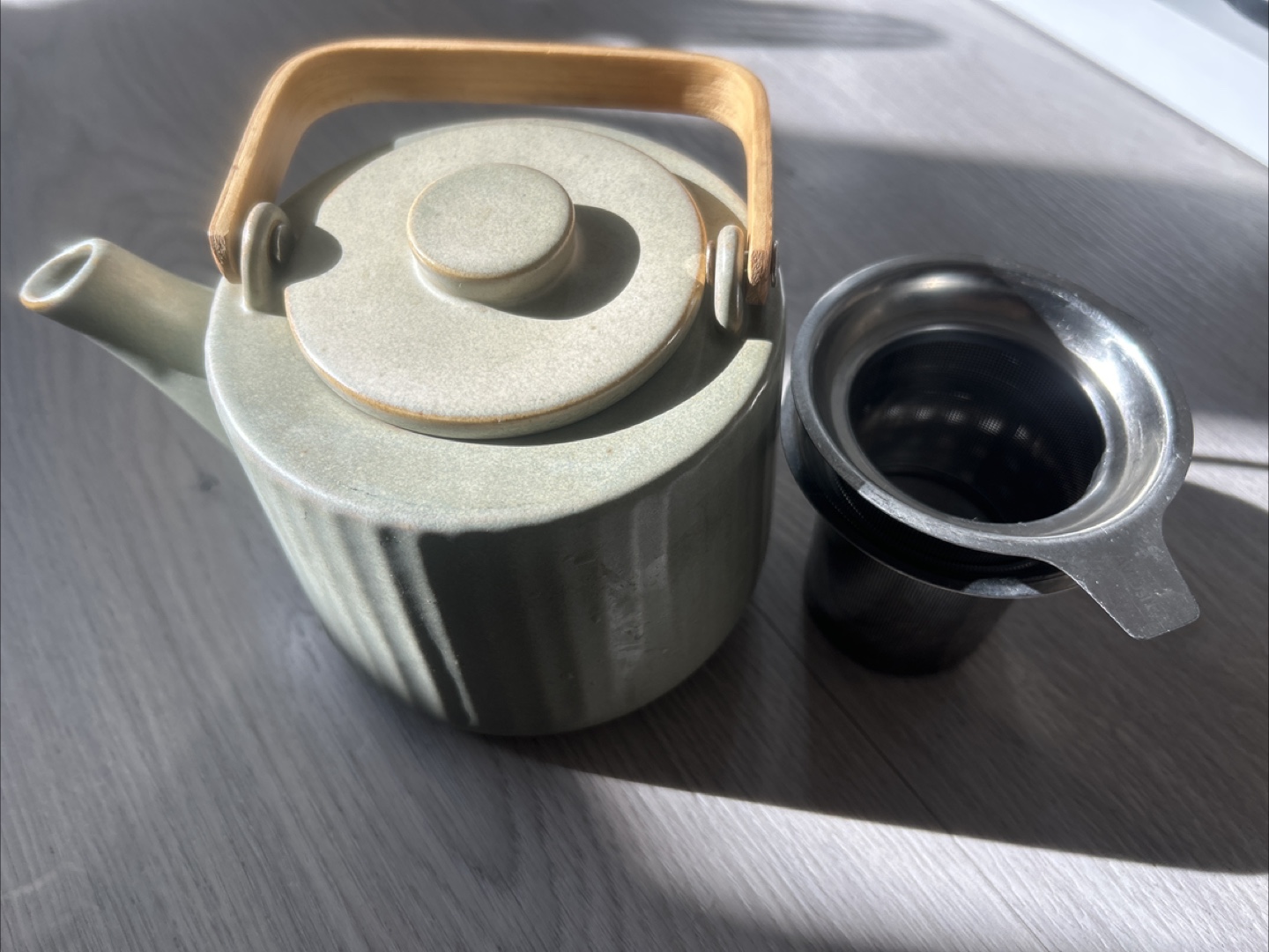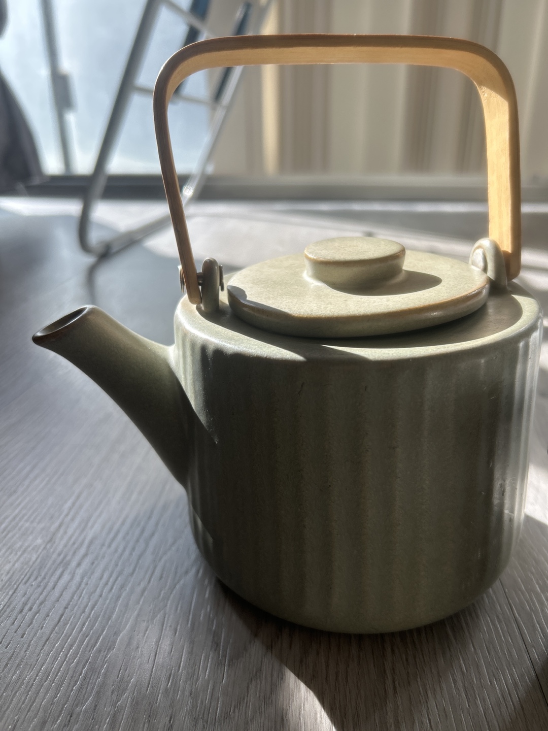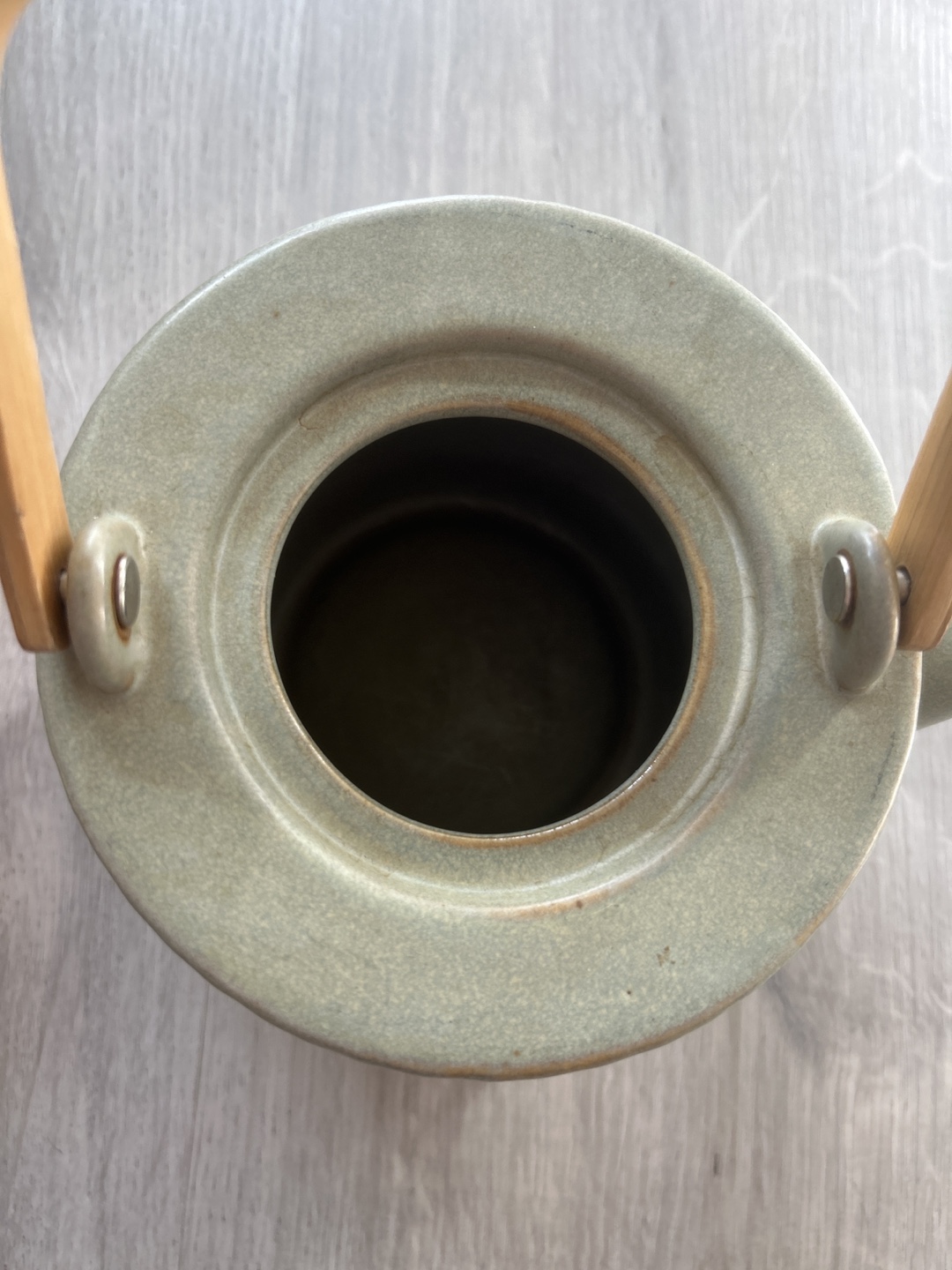 - Ceramic teapot with a light green glaze and a wooden handle