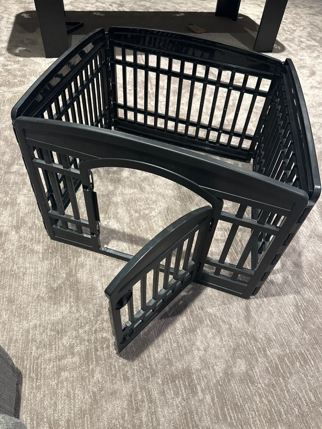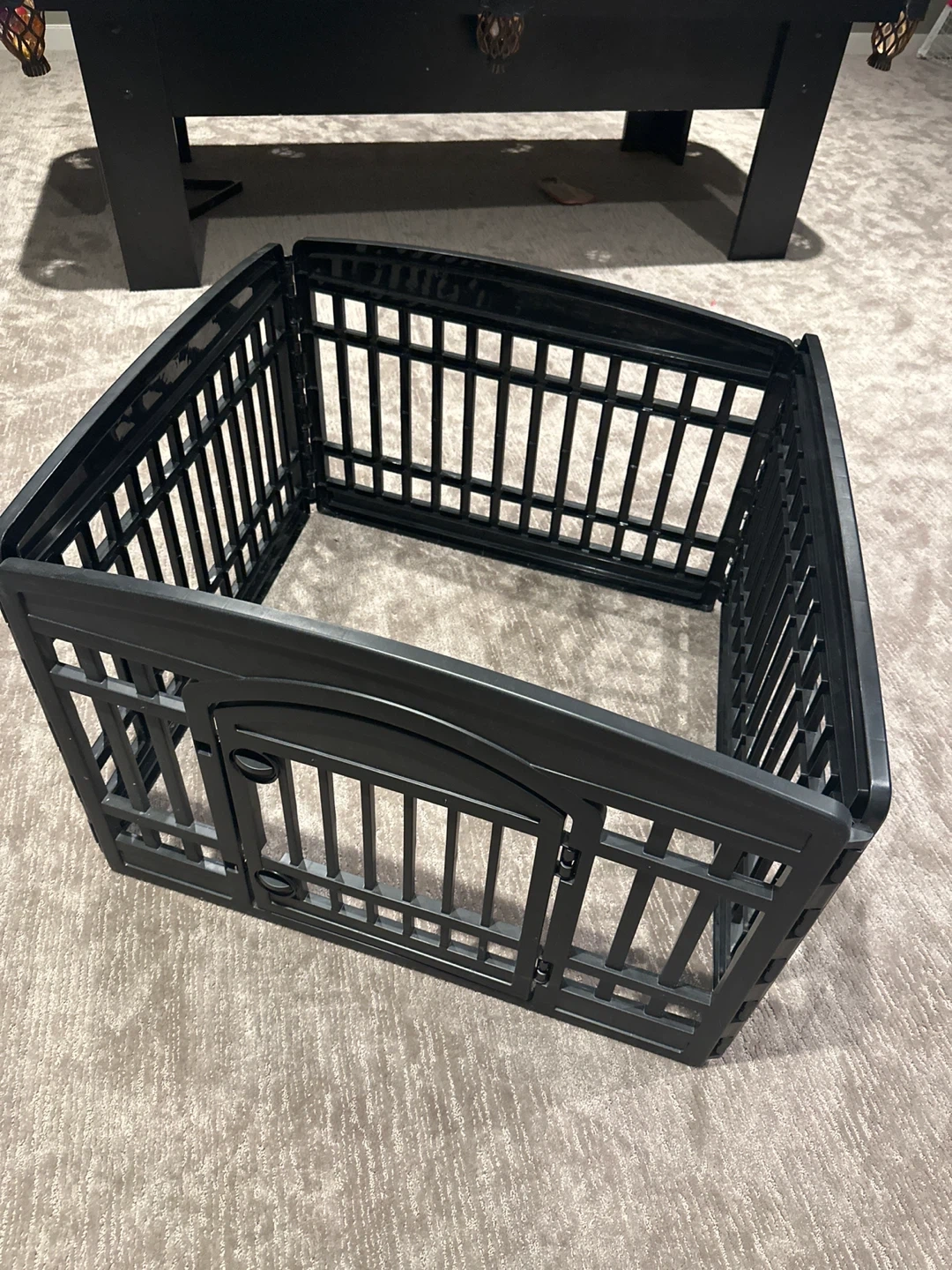 This is a black pet fence perfect for keeping pets contained. It's made of durable plastic and folds for easy storage. The gate's design allows for good ventilation. It's easy to set up and take down! Each panel is 33”W and 23” high. Fence area is a square 33”