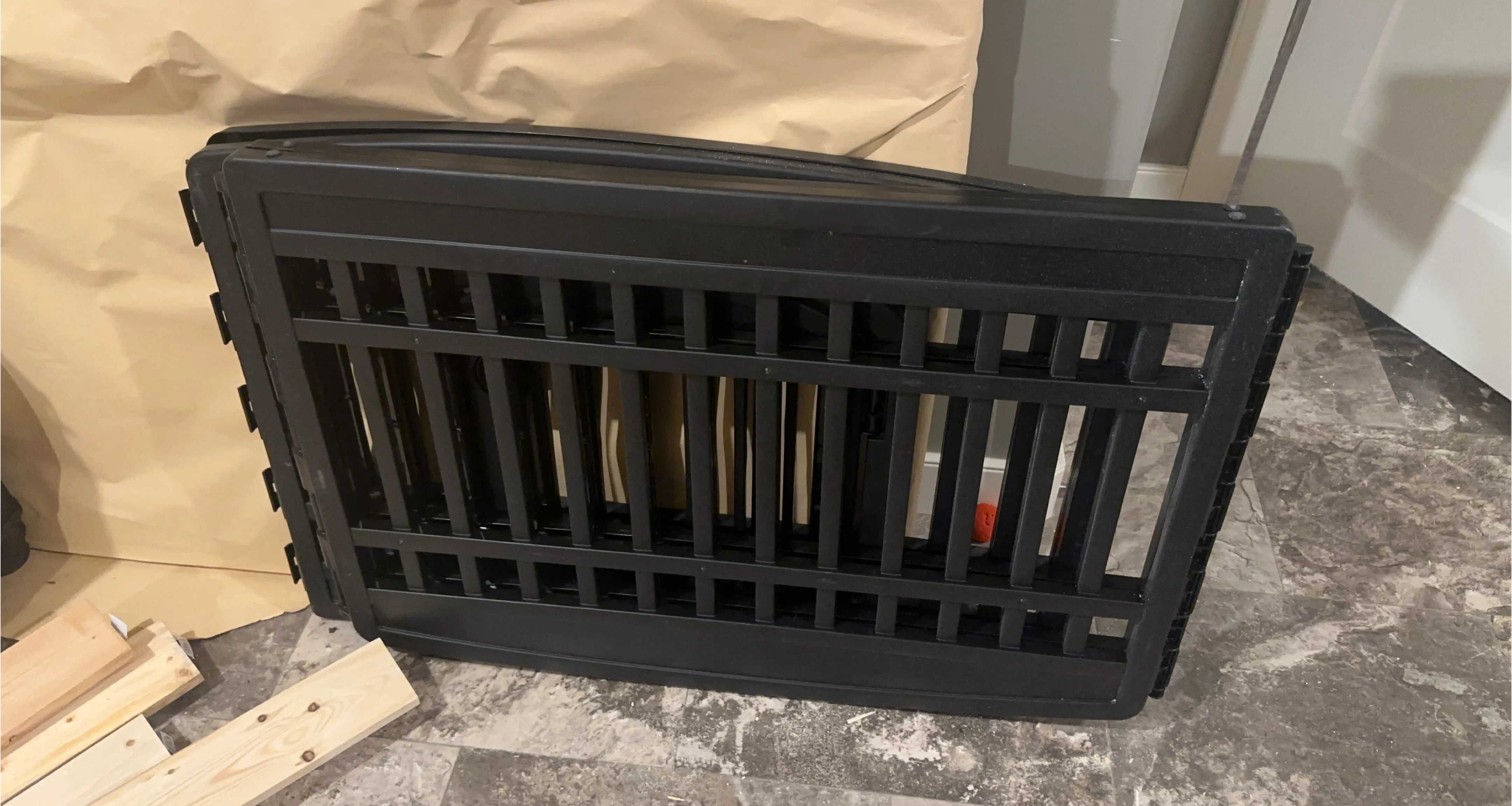 This is a black pet fence perfect for keeping pets contained. It's made of durable plastic and folds for easy storage. The gate's design allows for good ventilation. It's easy to set up and take down! Each panel is 33”W and 23” high. Fence area is a square 33”