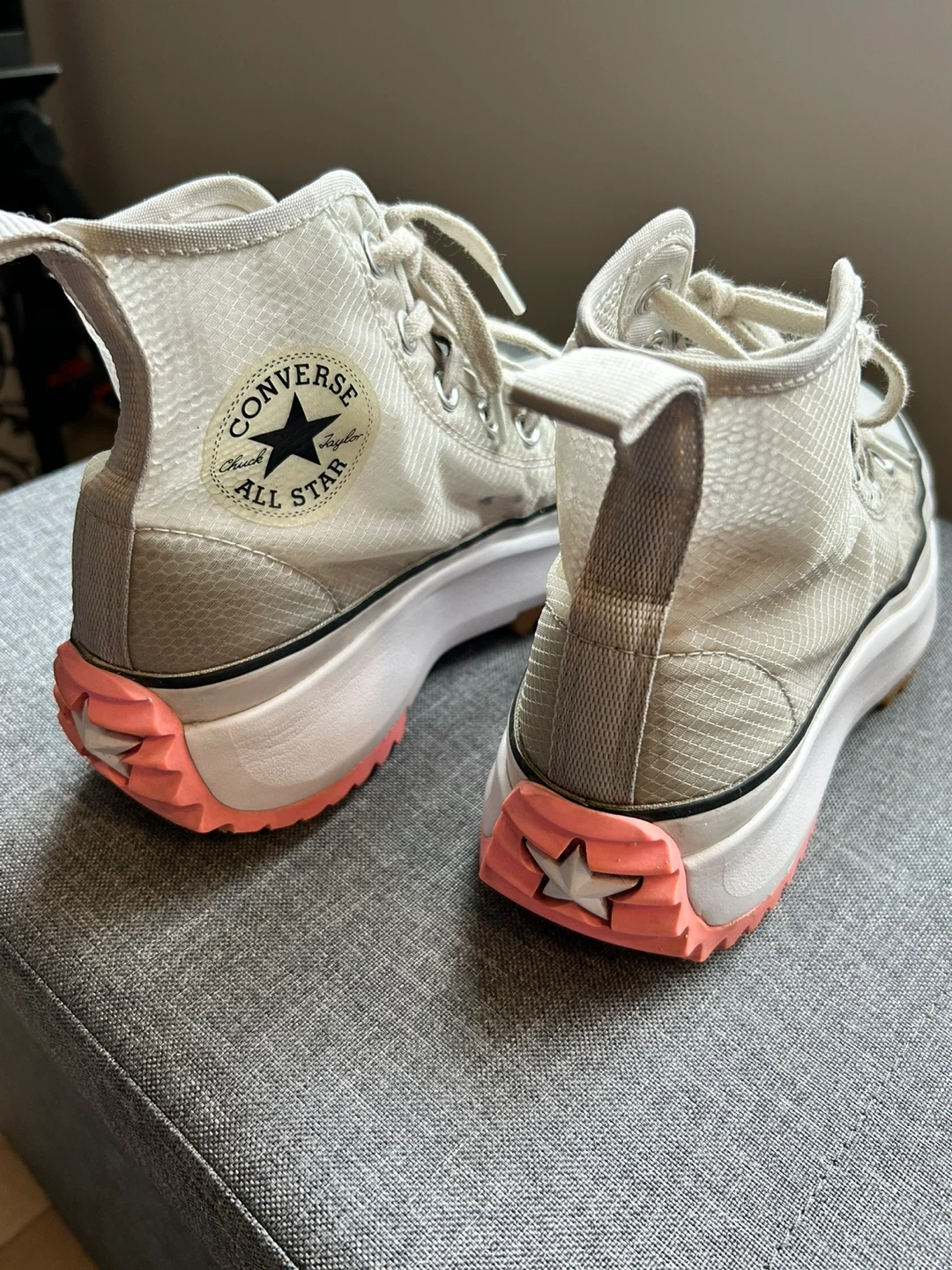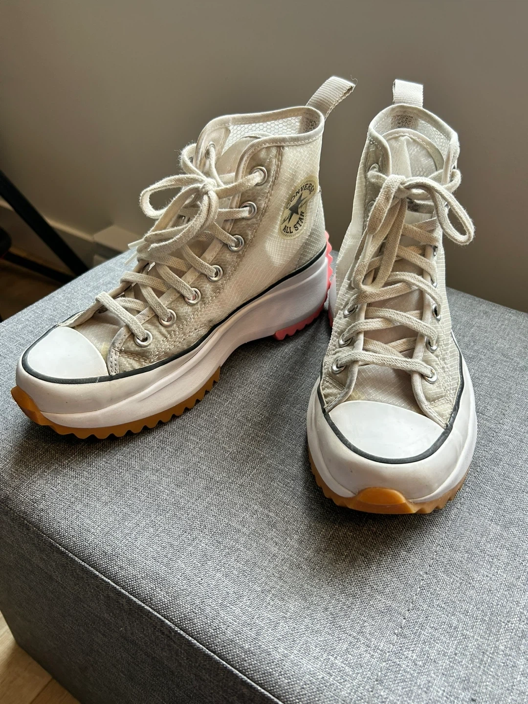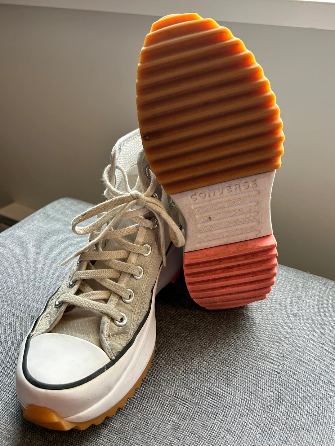 Converse Chuck Taylor All Star Run Star Hike high top sneakers in a neutral colourway. Unisex men’s size 5.5/women's size 7 (US). These kicks are built with a durable textile upper and a chunky platform sole.