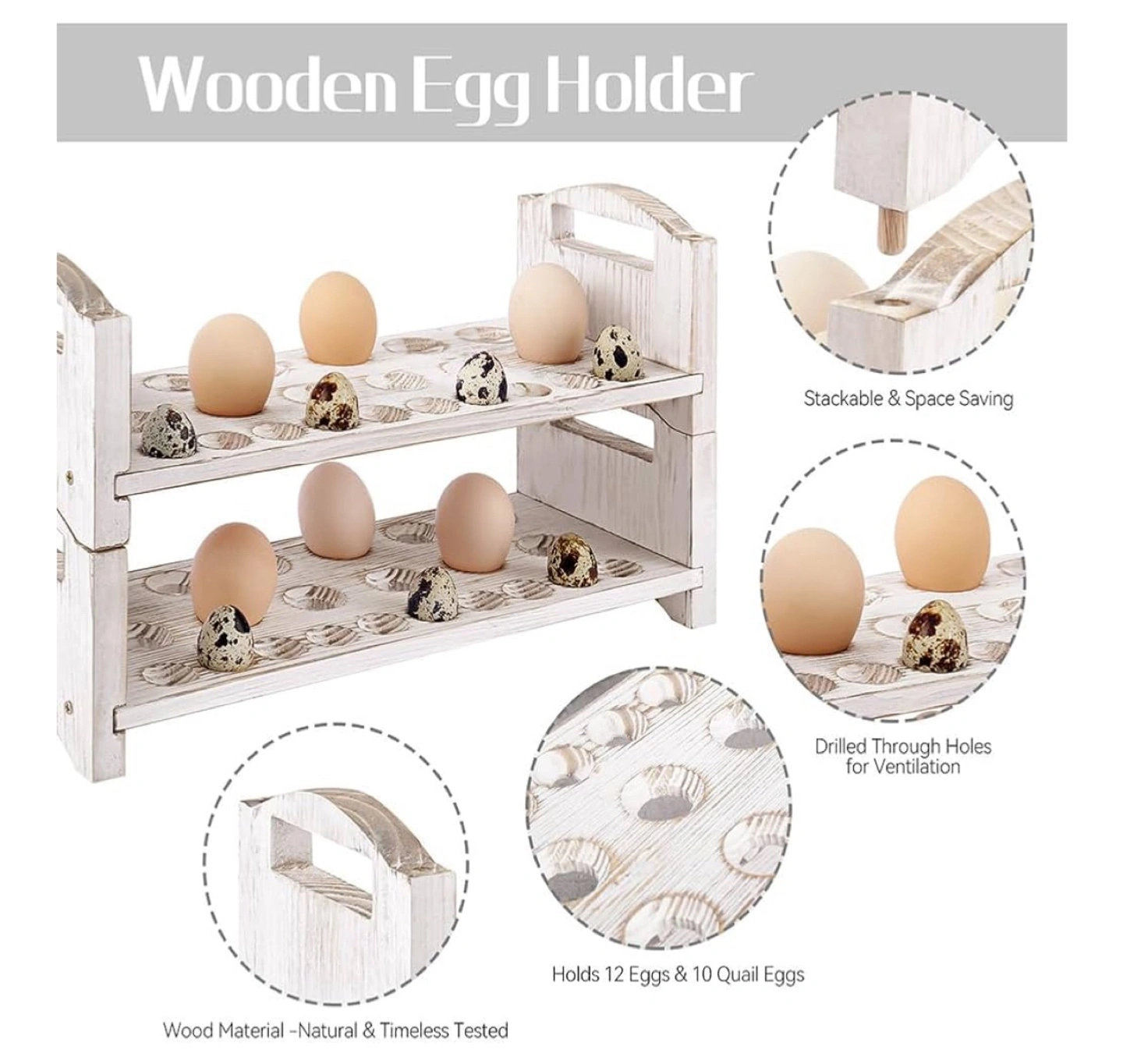 Keep your eggs organized with this lovely wooden egg holder rack! It has three tiers and can hold up to 3 dozen eggs, plus 30 quail eggs. It also features easy grip handles and anti-slip feet