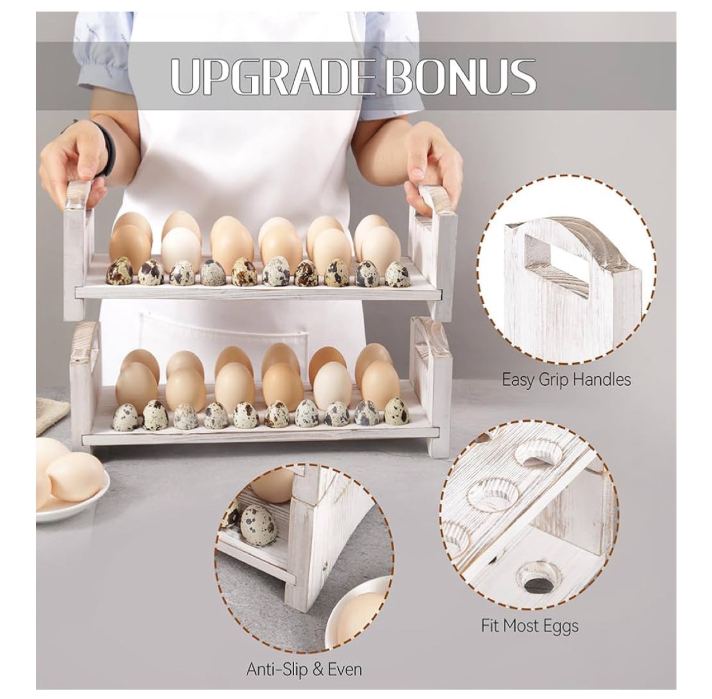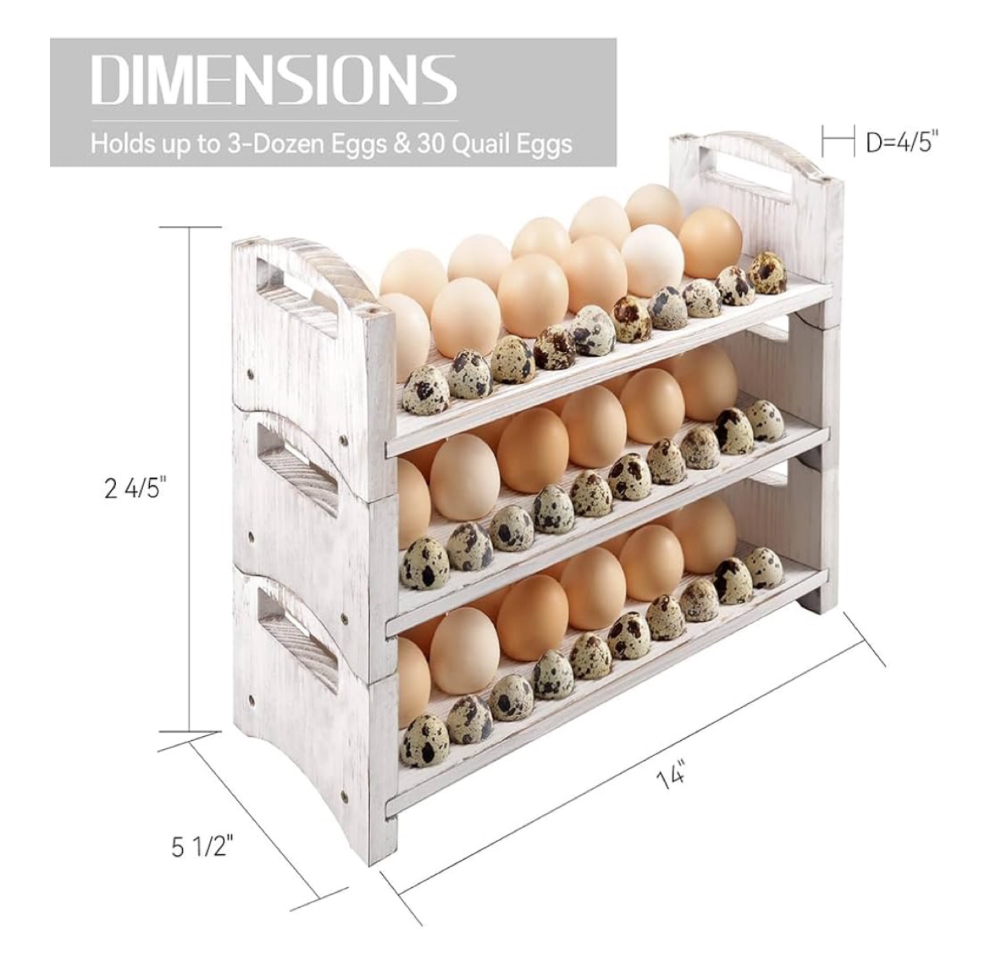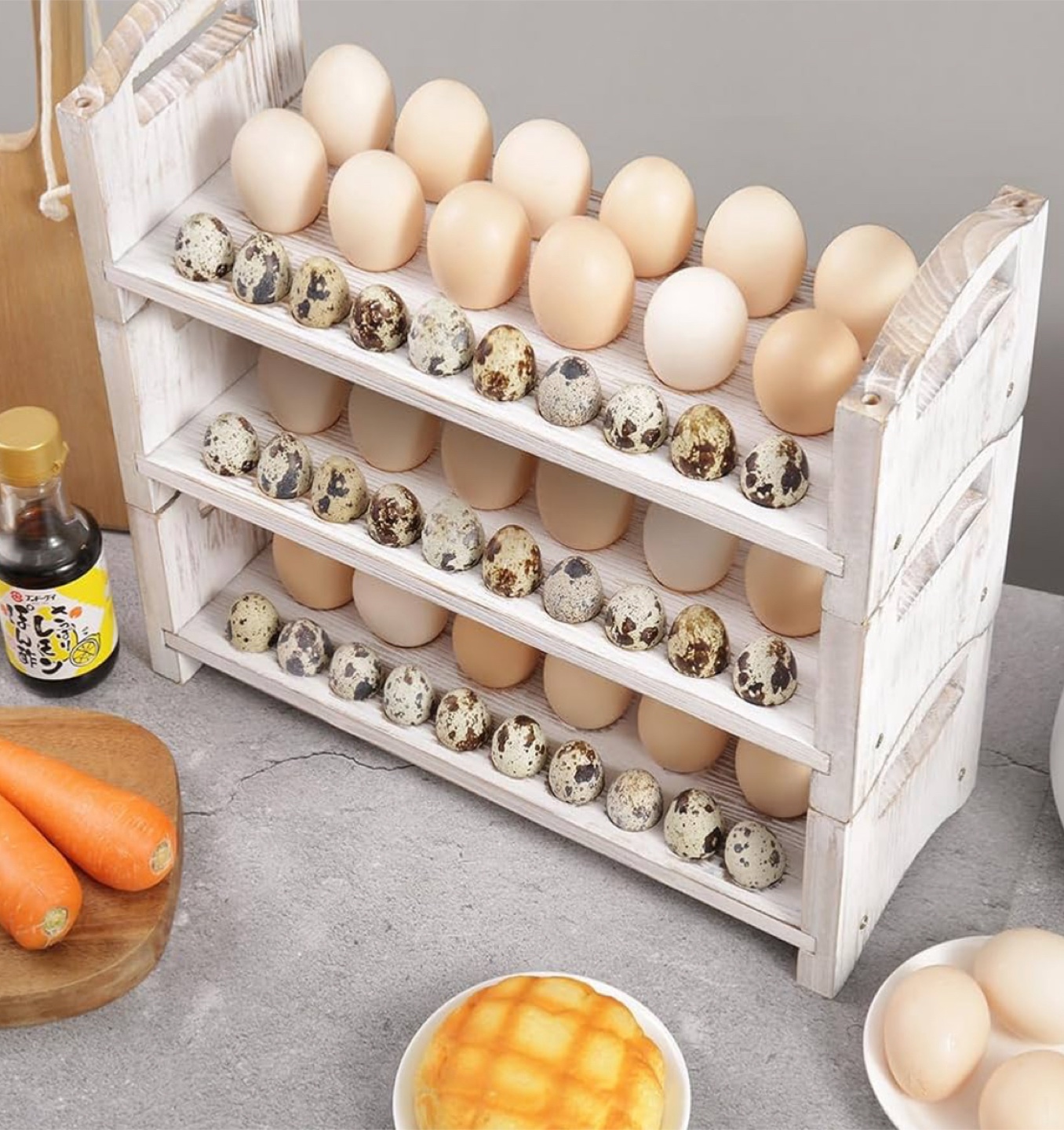 Keep your eggs organized with this lovely wooden egg holder rack! It has three tiers and can hold up to 3 dozen eggs, plus 30 quail eggs. It also features easy grip handles and anti-slip feet