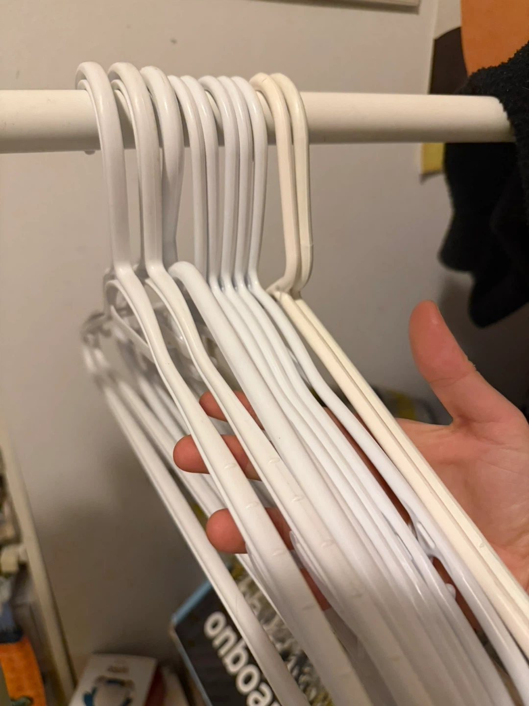 A set of ten white plastic hangers. These hangers are a standard size, suitable for most adult clothing. They're made of durable plastic.