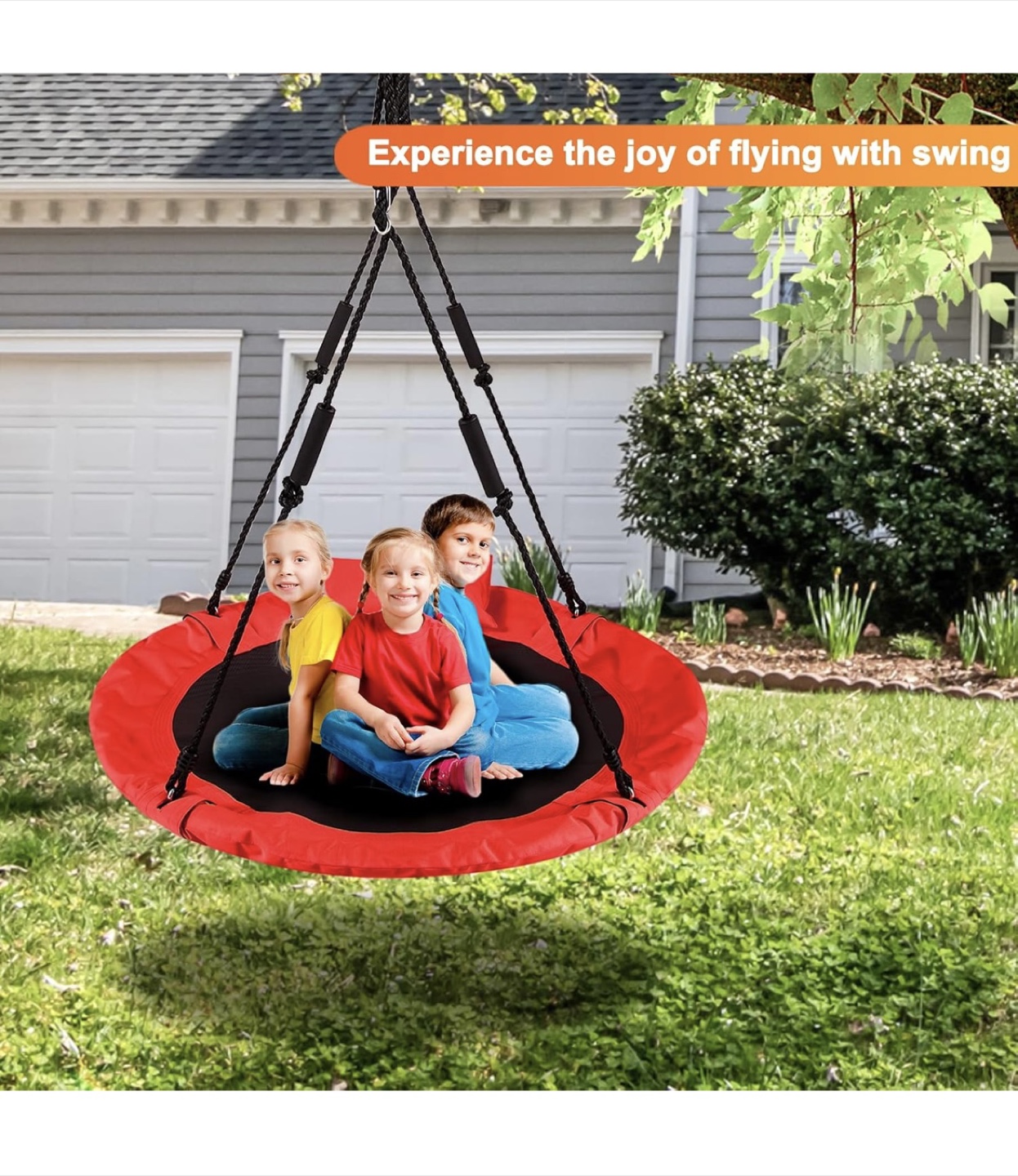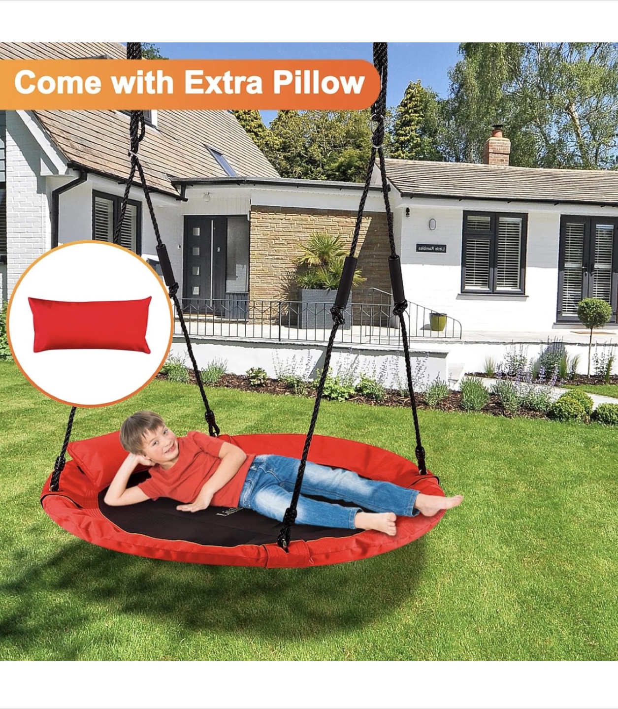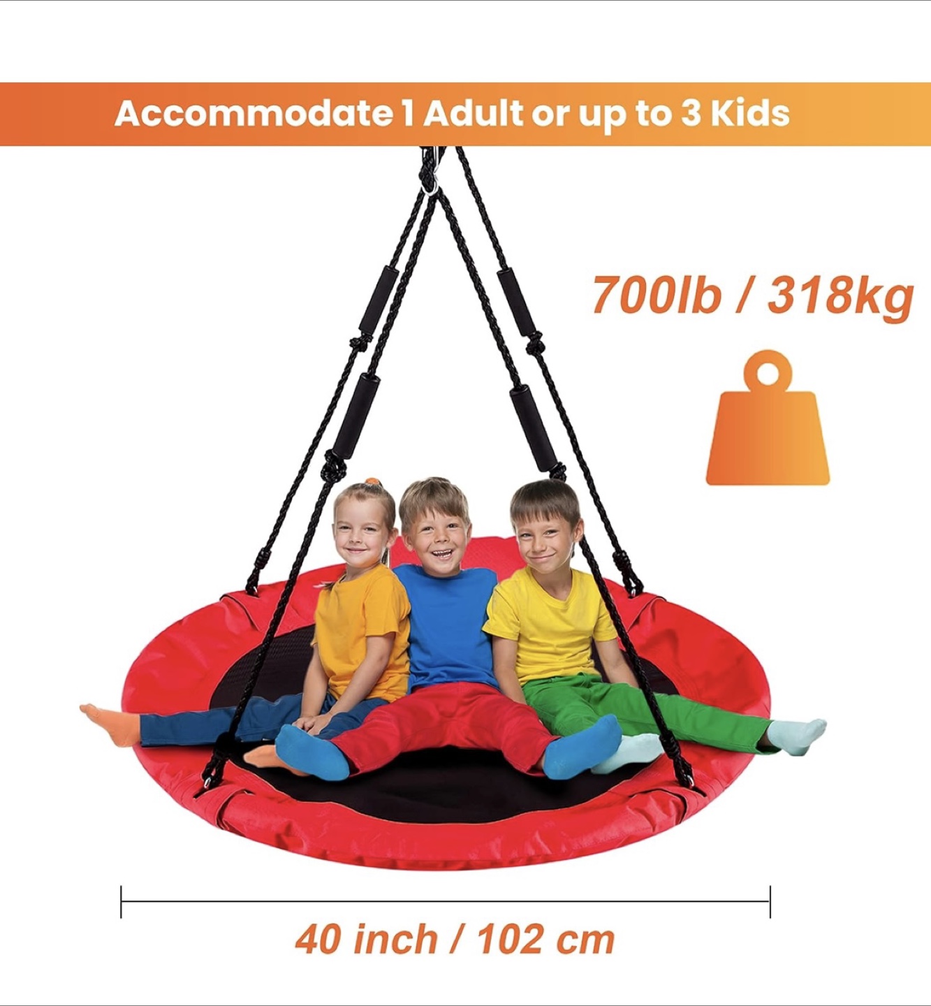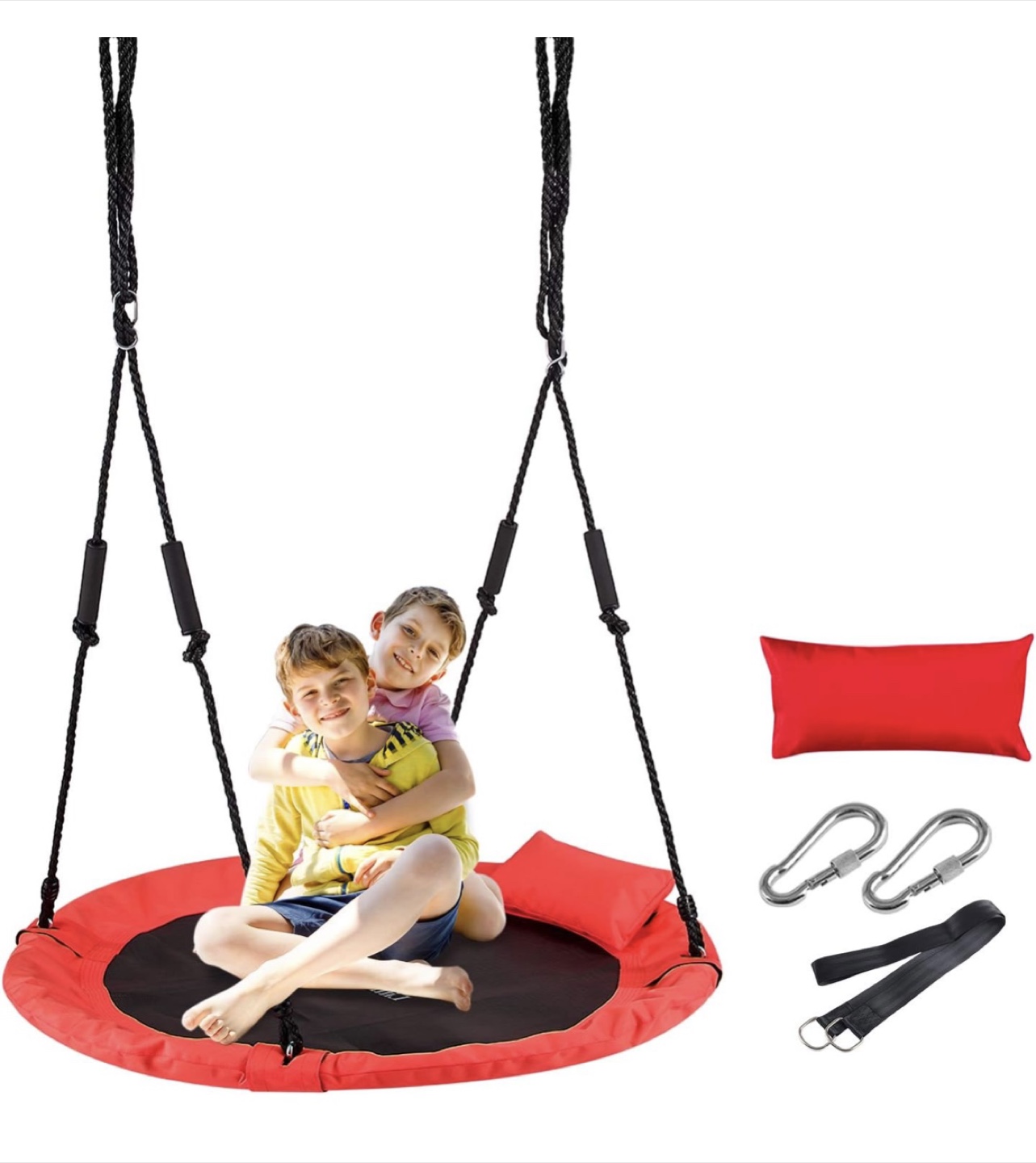 Get ready for some fun with this LittleLogiQ saucer tree swing! It's red and 40 inches in diameter, perfect for one adult or up to three kids. The swing features multi-strand ropes and upgraded 900D Oxford fabric for durability. It can accommodate up to 700lbs/318kg. Comes with an extra pillow for added comfort!