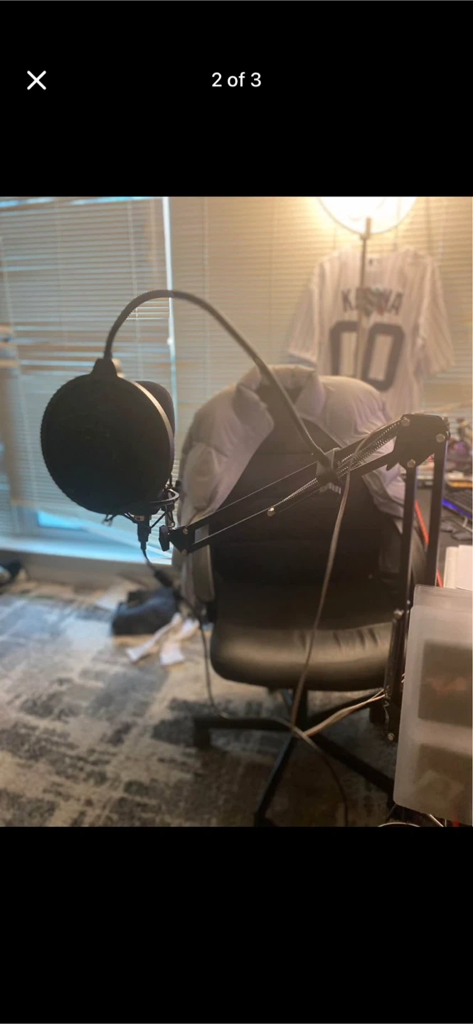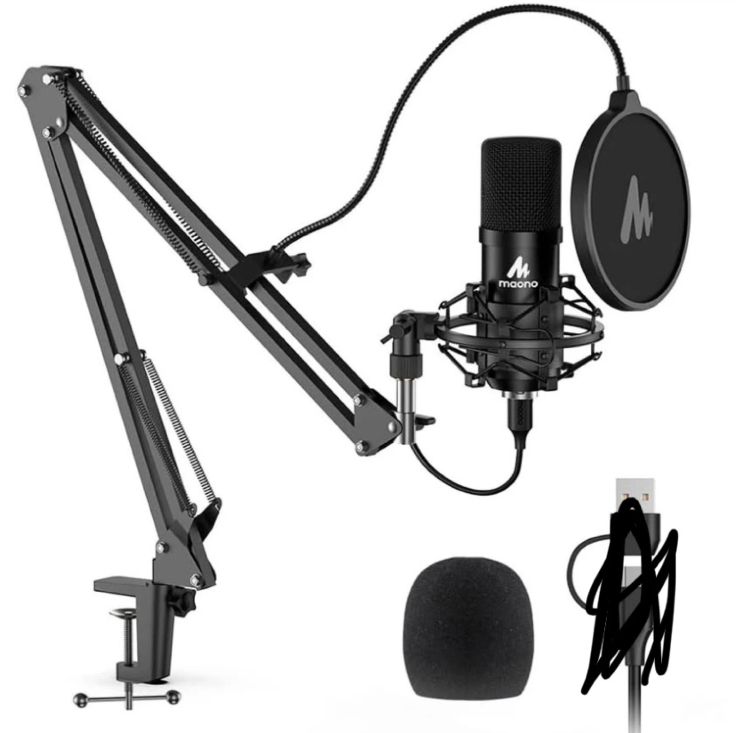 This is a Maono condenser microphone kit. It comes with a boom arm, shock mount, pop filter, and windscreen. The microphone connects via USB.