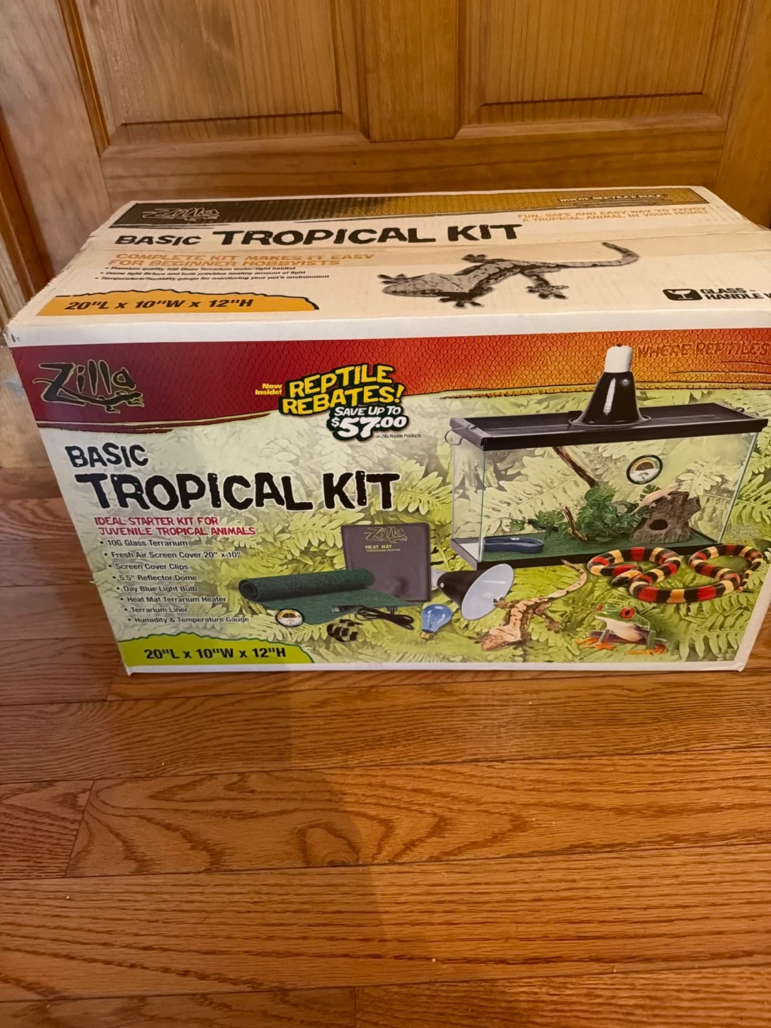 This Zilla Basic Tropical Kit is an ideal starter kit for juvenile tropical animals. It includes a 10G glass terrarium, screen cover, clips, reflector dome, light bulb, heat mat, terrarium liner, and a humidity & temperature gauge. The terrarium measures 20"L x 10"W x 12"H.