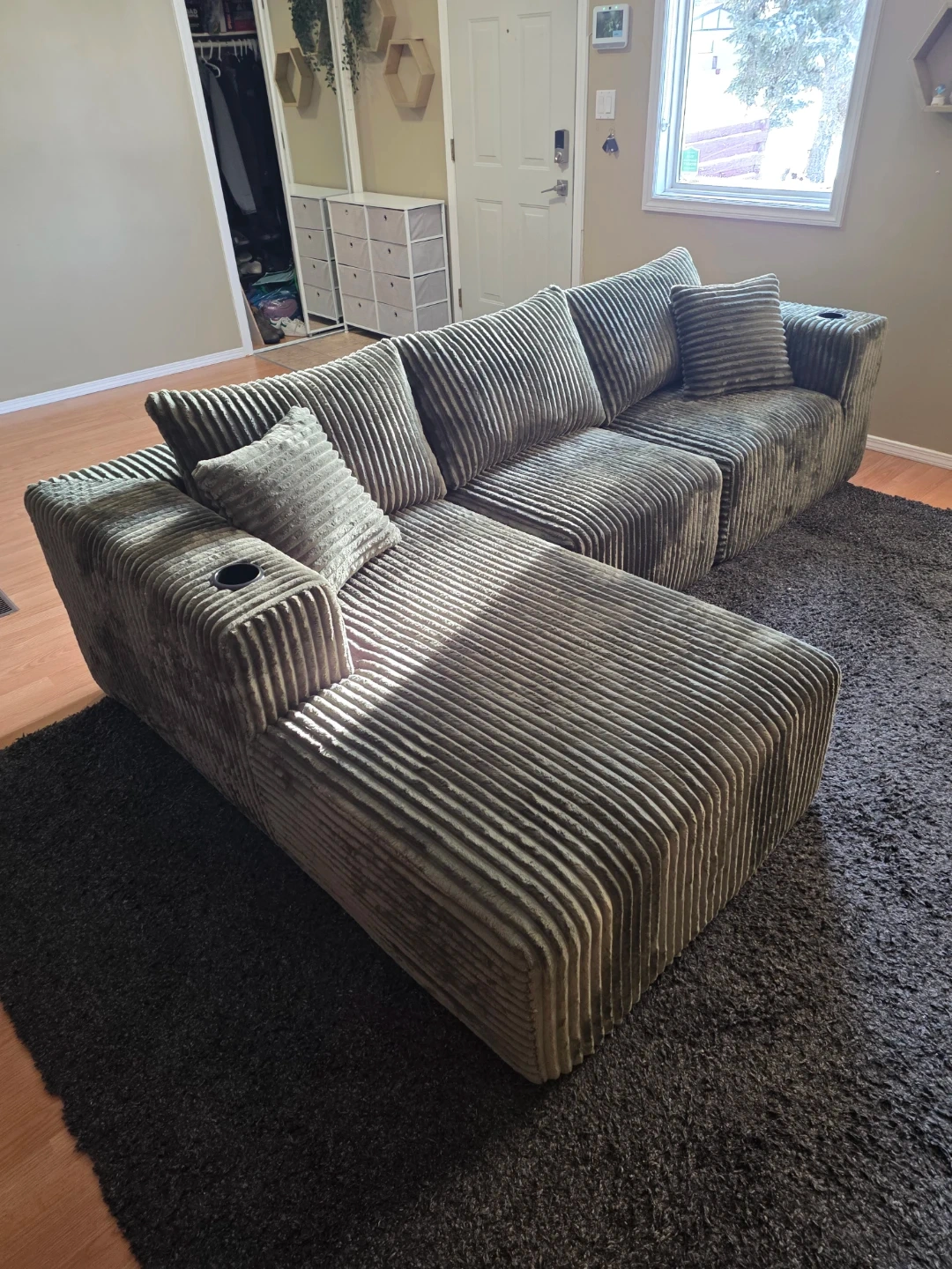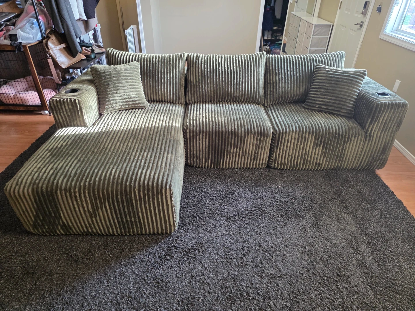 Comfy green corduroy sectional sofa with a chaise lounge. It includes cup holders built into the arms. Perfect for relaxing or entertaining guests!