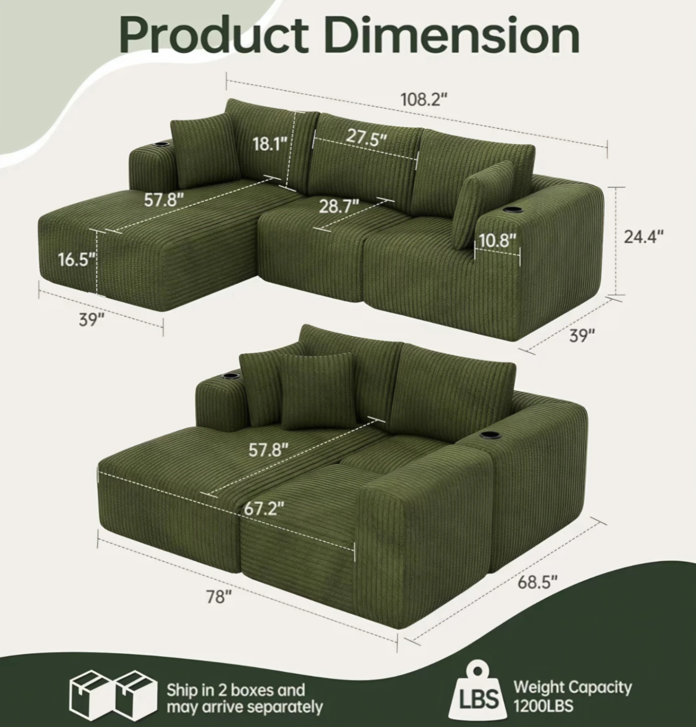 Green Corduroy Sectional Sofa with Chaise and Cup Holders